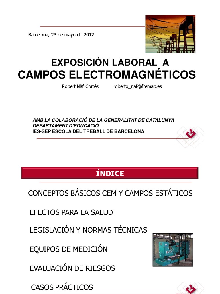 NDICE CONCEPTOS BSICOS CEM Y CAMPOS ESTTICOS EFECTOS PARA LA SALUD LEGISLACIN Y NORMAS TCNICAS EQUIPOS DE MEDICIN EVALUACIN DE RIESGOS CASOS PRCTICOS