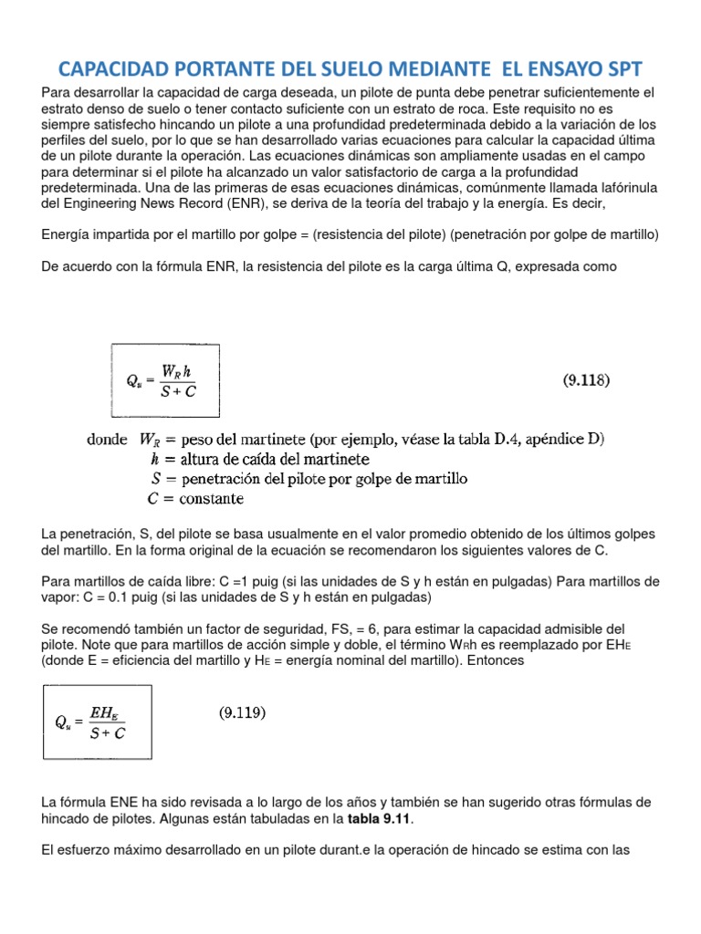 La frmula ENE ha sido revisada a lo largo de los aos y tambin se han sugerido otras frmulas de hincado de pilotes. Algunas estn tabuladas en la tabla 9.11. El esfuerzo mximo desarrollado en un pilote durant.e la operacin de hincado se estima con las