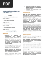 Aceite vegetal Solucin de albmina al 1% Reactivo de Fehling o Benedict Lugol ter Solucin de Sudan III en gotero Tinta roja en gotero Solucin de sulfato cprico al 1% Solucin de hidrxido de sodio al 20% y al 5% Acido clorhdrico concentrado 15Tubos de ensaye de 15x150 mm 1 Pipeta de 5 ml Mechero Gradilla Pinzas para tubo de ensaye Vaso de precipitado para bao mara Marcador indeleble Sharpie de preferencia negro Soporte universal PUNTOS CRITICOS DE CONTROL Leer cuidadosamente la prctica para saber lo que va a hacer. Leer la etiqueta antes de tomar la sustancia de su envase. Al calentar sustancias en tubos cuidar que la boca de los mismos no est dirigido hacia s mismo o algn compaero para evitar accidentes por proyecciones. No utilizar la misma pipeta (en caso de lquidos), o esptula (slidos) para tomar sustancias diferentes a fin de evitar contaminaciones. Utilizar perilla de seguridad para pipetear (nunca con la boca). Medir o pesar las sustancias con la mayor precisin posible. Al final de la prctica asear el rea de trabajo, material y equipo. Lavar muy bien las manos al terminar.