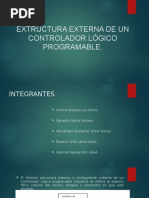 La estructura es la disposicin y orden de las partes dentro de un todo. Un controlador lgico programable est constituido por un conjunto de tarjetas o circuitos impresos, sobre los cuales estn ubicados componentes electrnicos. El controlador Programable tiene la estructura tpica de muchos sistemas programables, como por ejemplo una microcomputadora. La estructura bsica del hardware de un controlador Programable propiamente dicho est constituido por: Fuente de alimentacin Unidad de procesamiento central (CPU) Mdulos o bloques de entradas/salidas (E/S) Modulo de memorias Unidad de programacin Interfaces En algunos casos cuando el trabajo que debe realizar el controlador es ms exigente, se incluyen Mdulos Inteligentes. A. Fuente De Alimentacin La funcin de la fuente de alimentacin en un controlador, es suministrar la energa ala CPU y dems tarjetas segn la configuracin del PLC. + 5 V para alimentar a todas las tarjetas + 5.2 V para alimentar al programador + 24 V para los canales de lazo de corriente 20 mA.