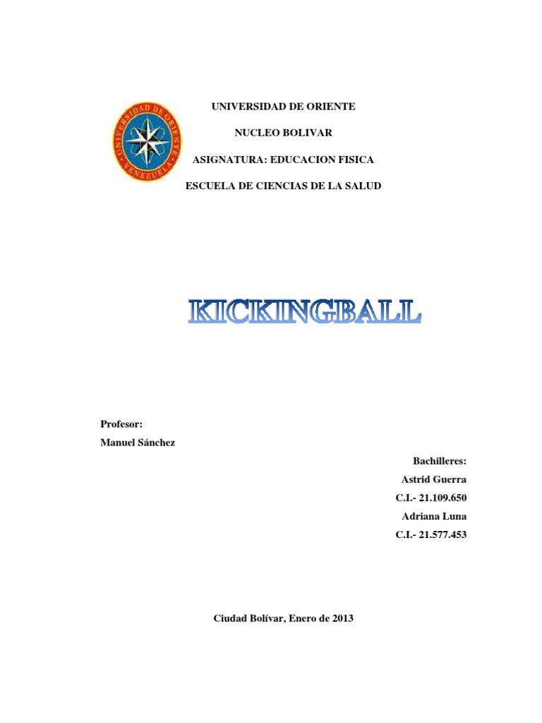 INTRODUCCION El presente trabajo que se va a desarrollar a continuacin, es con la finalidad de obtener conocimientos con respecto al Kickigball, su origen, en que consiste, su objetivo, duracin, campo oficial del juego, inicio del juego, strike, bola mala, pateador, aplicacin de la regla de knock-out y sus caractersticas. Este tema nos parece importante para un buen conocimiento de la materia y un excelente desarrollo acadmico, es por ello que aqu se expresara detalladamente. Esperando as que este trabajo aclare nuestras dudas, sirva de apoyo a nuestros compaeros y e indudablemente sea del agrado nuestro profesor.