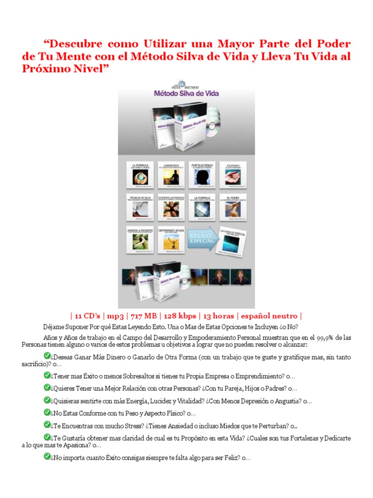 * La puerta escondida a una Resolucin de Problemas RAPIDA y SIN ESFUERZO. * Cmo desarrollar tu Habilidad Psquica, y utilizarla para tus desafos diarios. * MS: Disfruta del Ultimo ejercicio del Curso junto a unos Consejeros Muy Especiales. EXTRAS * Libro y Gua de ejercicios del Mtodo Silva de Vida * Exclusivo Ejercicio de Relajacin Para Mantener Tu Cuerpo y Mente en Perfecta Salud * 7 Sonidos especiales para Ayudarte a entrar en Estado con Increble Facilidad y Cuantas Veces Quieras: Alpha, Delta, Theta, El Ruido Blanco.