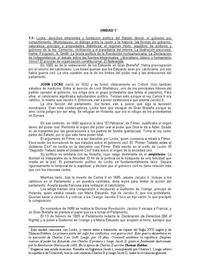 Montesquieu: el dilogo entre la razn y la historia; las formas de gobierno: naturaleza, principio y propiedades distintivas; el rgimen mixto: equilibrio de poderes y gobierno de la ley. Comercio, civilizacin y el paradigma del inters. La Ilustracin escocesa: Hume, Ferguson, A. Smith. La teora poltica de la Revolucin norteamericana. La Declaracin de Independencia; el debate sobre las fuentes intelectuales: liberalismo clsico o humanismo cvico? El proceso de organizacin constitucional. El federalista. En 1660 se da la restauracin de los Estuardo en Gran Bretaa 2. Haba preocupacin por el retorno del catolicismo. Los tories queran que los Estuardo sean pro catolicismo, por eso haba guerra civil. La otra cuestin era la de los lmites del poder real y las atribuciones del parlamento. JOHN LOCKE naci en 1632 y se form clsicamente en Oxford. Hizo tambin estudios de medicina. Entra al servicio de Lord Shafisbury, uno de los principales lderes del partido opositor al gobierno, los whigs (era el grupo protestante que tema al papismo). Para ellos, el catolicismo significaba autoritarismo poltico. Teman esto porque el rey Carlos II era catlico, lo mismo que Jacobo II. Entonces, van a poner obstculos a que asuma Jacobo II. La otra faccin del parlamento, los tories, van a querer que siga la sucesin monrquica. Eran ms conservadores. Locke tuvo que escapar de Gran Bretaa porque su amo corra peligro por ser whig. Se refugian en Holanda, que era el refugio de los protestantes en Europa. En ese contexto, en 1680 aparece la obra El Patriarca, de Filmer. Justificaba el origen divino del poder real. Remonta el origen del poder real al poder que Dios le da a Adn. Desde l, se transmiti por las generaciones a los padres de familia (patriarcas). Toma al rey como padre del Estado, por lo que este tiene poder total. El argumento de Filmer va a ser discutido por Locke, quien comienza a rebatir a Filmer. Esos sern los borradores de sus tratados sobre el gobierno civil. El Primer Tratado sobre el Gobierno Civil se centra en la discusin con Filmer. Est escrito en el exilio de Locke. El Segundo Tratado sobre el Gobierno Civil trata sobre el origen de la sociedad civil. Su poltica es solidaria con su filosofa, cuyo rasgo dominante es el empirismo. La libertad es inseparable de la felicidad. El fin de la poltica es la bsqueda de una felicidad que resida en la paz. El pensamiento poltico de Locke es fundamentalmente laico. Separa rigurosamente lo temporal de lo espiritual, y declara que el gobierno civil no tiene relacin ms que con los intereses civiles. Mientras tanto, tras la muerte de Carlos II en 1685, asume Jacobo II. Incluye a los catlicos en el Parlamento y en puestos centrales; dicta leyes para limitar la accin del parlamento. Acepta ayuda francesa para restaurar el catolicismo. Los whigs traman otra conspiracin e involucran a Guillermo de Orange, prncipe de Holanda; quien estaba casado con Mara Estuardo, hija de Jacobo II, que era protestante. Queran sacar a Jacobo II y colocar a los Orange. Jacobo II tuvo un hijo varn, lo que precipit la conspiracin. En noviembre de 1688 se realiza la Gloriosa Revolucin. Jacobo II escapa a Francia, y en Gran Bretaa se plantea el papel que va a tomar el Parlamento. El 13 de febrero de 1689 el Parlamento redacta la Declaracin de Derechos (Bill of Rights) y le piden a Guillermo de Orange y a Mara Estuardo que acepten el trono, siempre que