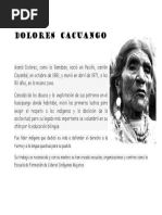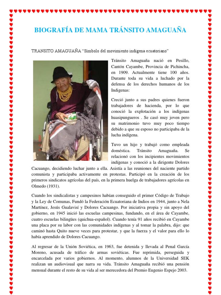 TRANSITO AMAGUAA Smbolo del movimiento indgena ecuatoriano Trnsito Amaguaa naci en Pesillo, Cantn Cayambe, Provincia de Pichincha, en 1909. Actualmente tiene 100 aos. Durante toda su vida a luchado por la defensa de los derechos humanos de los Indigenas: Creci junto a sus padres quienes fueron trabajadores de hacienda, por lo que conoci la explotacin a los indgenas huasipungueros . Se cas muy joven pero su matrimonio tuvo muy poco tiempo debido a que su esposo no participaba de la lucha indgena. Tuvo un hijo y trabaj como empleada domstica. Trnsito Amaguaa. Se relacion con los incipientes movimientos indgenas y conoci a la dirigente Dolores Cacuango, decidiendo luchar junto a ella. Asista a las reuniones del naciente partido comunista y participaba activamente en protestas. Particip en la creacin de los primeros sindicatos agrcolas del pas, en la primera huelga de trabajadores agrcolas en Olmedo (1931). Cuando los sindicalistas y campesinos haban conseguido el primer Cdigo de Trabajo y la Ley de Comunas, Fund la Federacin Ecuatoriana de Indios en 1944, junto a Nela Martnez, Jess Gualavis y Dolores Cacuango. Por iniciativa propia y sin apoyo del gobierno, en 1945 inici las escuelas campesinas, fundando, en el rea de Cayambe, cuatro escuelas bilinges (quichua-espaol). Cuando tena 91 aos recibi en Cayambe una placa por su labor con las comunidades indgenas y al tomar la palabra, dijo: que camin hasta Quito nueve veces para protestar, y que la fuerza y el valor para ello lo haba aprendido de Dolores Cacuango. Al regresar de la Unin Sovitica, en 1963, fue detenida y llevada al Penal Garca Moreno, acusada de trfico de armas soviticas. Fue reprimida, perseguida y encarcelada por varios gobiernos. Al momento, alumnos de la Universidad SEK realizan un audiovisual que narra su vida. Trnsito Amaguaa recibi una pensin mensual durante el resto de su vida al ser merecedora del Premio Eugenio Espejo 2003.