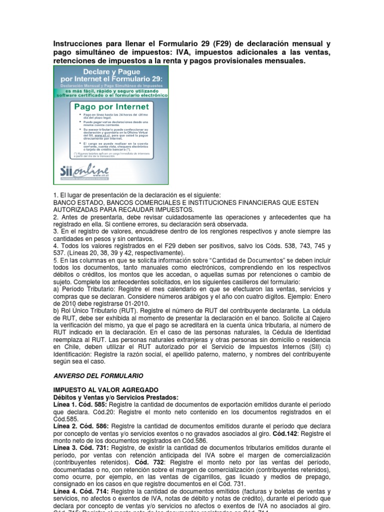 1. El lugar de presentacin de la declaracin es el siguiente: BANCO ESTADO, BANCOS COMERCIALES E INSTITUCIONES FINANCIERAS QUE ESTEN AUTORIZADAS PARA RECAUDAR IMPUESTOS. 2. Antes de presentarla, debe revisar cuidadosamente las operaciones y antecedentes que ha registrado en ella. Si contiene errores, su declaracin ser observada. 3. En el registro de valores, encudrese dentro de los renglones respectivos y anote siempre las cantidades en pesos y sin centavos. 4. Todos los valores registrados en el F29 deben ser positivos, salvo los Cds. 538, 743, 745 y 537. (Lneas 20, 38, 39 y 42, respectivamente). 5. En las columnas en que se solicita informacin sobre Cantidad de Documentos se deben incluir todos los documentos, tanto manuales como electrnicos, comprendiendo en los respectivos dbitos o crditos, los montos que les accedan, o aquellas sumas por retenciones o cambio de sujeto. Complete los antecedentes solicitados, en los siguientes casilleros del formulario: a) Perodo Tributario: Registre el mes calendario en que se efectuaron las ventas, servicios y compras que se declaran. Considere nmeros arbigos y el ao con cuatro dgitos. Ejemplo: Enero de 2010 debe registrarse 01-2010. b) Rol nico Tributario (RUT). Registre el nmero de RUT del contribuyente declarante. La cdula de RUT, debe ser exhibida al momento de presentar la declaracin en el banco. Solicite al Cajero la verificacin del mismo, ya que el pago se acreditar en la cuenta nica tributaria, al nmero de RUT indicado en la declaracin. En el caso de las personas naturales, la Cdula de Identidad reemplaza al RUT. Las personas naturales extranjeras y otras personas sin domicilio o residencia en Chile, deben utilizar el RUT autorizado por el Servicio de Impuestos Internos (SII) c) Identificacin: Registre la razn social, el apellido paterno, materno, y nombres del contribuyente segn sea el caso. ANVERSO DEL FORMULARIO IMPUESTO AL VALOR AGREGADO Dbitos y Ventas y/o Servicios Prestados: Lnea 1. Cd. 585: Registre la cantidad de documentos de exportacin emitidos durante el perodo que declara. Cd.20: Registre el monto neto contenido en los documentos registrados en el Cd.585. Lnea 2. Cd. 586: Registre la cantidad de documentos emitidos durante el perodo que declara por concepto de ventas y/o servicios exentos o no gravados asociados al giro. Cd.142: Registre el monto neto de los documentos registrados en Cd.586. Lnea 3. Cd. 731: Registre, de existir la cantidad de documentos tributarios emitidos durante el perodo, por ventas con retencin anticipada del IVA sobre el margen de comercializacin (contribuyentes retenidos). Cd. 732: Registre el monto neto por las ventas del perodo, documentadas o no, con retencin sobre el margen de comercializacin (contribuyentes retenidos), como ocurre, por ejemplo, en las ventas de cigarrillos, gas licuado y medios de prepago, consignado en los casos en que registre documentos en el Cd. 731. Lnea 4. Cd. 714: Registre la cantidad de documentos emitidos (facturas y boletas de ventas y servicios, no afectos o exentos de IVA, notas de dbito y notas de crdito), durante el perodo que declara por concepto de ventas y/o servicios no afectos o exentos de IVA no asociados al giro. Cd. 715: Registre el monto neto de los documentos registrados en Cd. 714. Lnea 5. Cd. 515: Registre la cantidad de facturas de compra, notas de dbito y notas de crdito recibidas, asociadas a facturas de compra y facturas de inicio emitidas con retencin total producto del cambio de sujeto que afecta a las operaciones realizadas durante el perodo que declara. Las