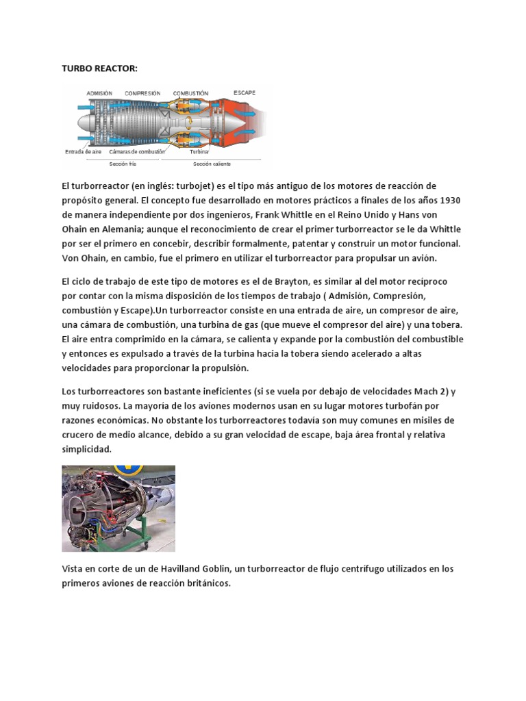 El turborreactor (en ingls: turbojet) es el tipo ms antiguo de los motores de reaccin de propsito general. El concepto fue desarrollado en motores prcticos a finales de los aos 1930 de manera independiente por dos ingenieros, Frank Whittle en el Reino Unido y Hans von Ohain en Alemania; aunque el reconocimiento de crear el primer turborreactor se le da Whittle por ser el primero en concebir, describir formalmente, patentar y construir un motor funcional. Von Ohain, en cambio, fue el primero en utilizar el turborreactor para propulsar un avin. El ciclo de trabajo de este tipo de motores es el de Brayton, es similar al del motor recproco por contar con la misma disposicin de los tiempos de trabajo ( Admisin, Compresin, combustin y Escape).Un turborreactor consiste en una entrada de aire, un compresor de aire, una cmara de combustin, una turbina de gas (que mueve el compresor del aire) y una tobera. El aire entra comprimido en la cmara, se calienta y expande por la combustin del combustible y entonces es expulsado a travs de la turbina hacia la tobera siendo acelerado a altas velocidades para proporcionar la propulsin. Los turborreactores son bastante ineficientes (si se vuela por debajo de velocidades Mach 2) y muy ruidosos. La mayora de los aviones modernos usan en su lugar motores turbofn por razones econmicas. No obstante los turborreactores todava son muy comunes en misiles de crucero de medio alcance, debido a su gran velocidad de escape, baja rea frontal y relativa simplicidad.