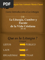 Cmo podra ser ejercicio del Sacerdocio de Cristo, con su originalidad, si se queda en algo meramente antropolgico? e) Una catequesis simblica o un acto de concientizacin comunitaria. La celebracin supone y exige catequesis, pero no podemos convertirla en una explicacin de todo lo que se hace y se dice. Cmo podra ser una accin simblica si prevalece lo racional y verbal? Menos an si instrumentalizamos la celebracin para inculcar una idea (poltica, de consumo, de protesta, de vanidad, de campaa para una accin). 2. LO QUE ES LA LITURGIA La Liturgia tiene una parte externa y sensible (la celebracin y sus signos sensibles), y de una parte interna, invisible y sobrenatural (la presencia activa de la obra de nuestra salvacin en Cristo). Algunos definen la Liturgia del exterior al interior: Es un sistema de oraciones, ritos y signos que la Iglesia reconoce como su culto pblico oficial, por el cual realiza su encuentro con Cristo, glorifica al Padre y recibe santificacin. Pide que la accin haya sido instituida por Cristo o por la Iglesia; se realice en nombre de Cristo y de la Iglesia; por personas con poder ministerial y encargo oficial; y en conformidad con las normas establecidas; que se ordene a la glorificacin de Dios y a la santificacin de los hombres. Otros la definen del interior al exterior: Es el ejercicio del Sacerdocio del Cristo total, Cabeza y miembros, en una accin sagrada eclesial en la cual se actualiza la gloria de Dios en la santificacin humana. Es la actuacin ltima del misterio encarnatorio y Pascual de Cristo, en un complejo de signos sensibles con los cuales Cristo resucitado, en la Iglesia y a travs de la Iglesia, contina su obra salvfica, culminada en el Misterio Pascual, concentrando as la Historia de la Salvacin. En conclusin, la liturgia es una accin simblica (elemento externo) donde est presente y actuante el Misterio de Cristo y el Misterio de la Iglesia. Tres son, pues, los constitutivos de una accin litrgica: a) Memorial del Misterio de Cristo. b) Accin sacramental de la Iglesia. c) Sistema simblico de comunicacin. 3. ALGUNAS CONSECUENCIAS: a) La Liturgia es accin. No es teora, sabidura secreta, doctrina, escuela, sino accin. Termina en "urgia", como siderurgia, metalurgia, u orga. Es un "drama", que comporta movimiento, tiene un dinamismo interior regido por leyes propias (mediacin sensible, dilogo, compromiso total de la persona, comunin, etc.). No consiste en empalmar artificialmente ritos y palabras, sino el movimiento armnico de un conjunto de elementos que se va desarrollando, amplificando, culminando y concluyendo, como la Alianza que Dios hace en la historia con su pueblo. Tiene su ritmo y lo anima la vitalidad del soplo divino. Los momentos principales de toda celebracin son: convocacin (asamblea litrgica, signo de la Iglesia en cuanto convocacin de creyentes en torno a Cristo resucitado), dilogo salvfico (escucha de la Palabra y respuesta a ella), signos con los cuales se sella la alianza de Dios con su pueblo. b) La Liturgia es una accin simblica. 12