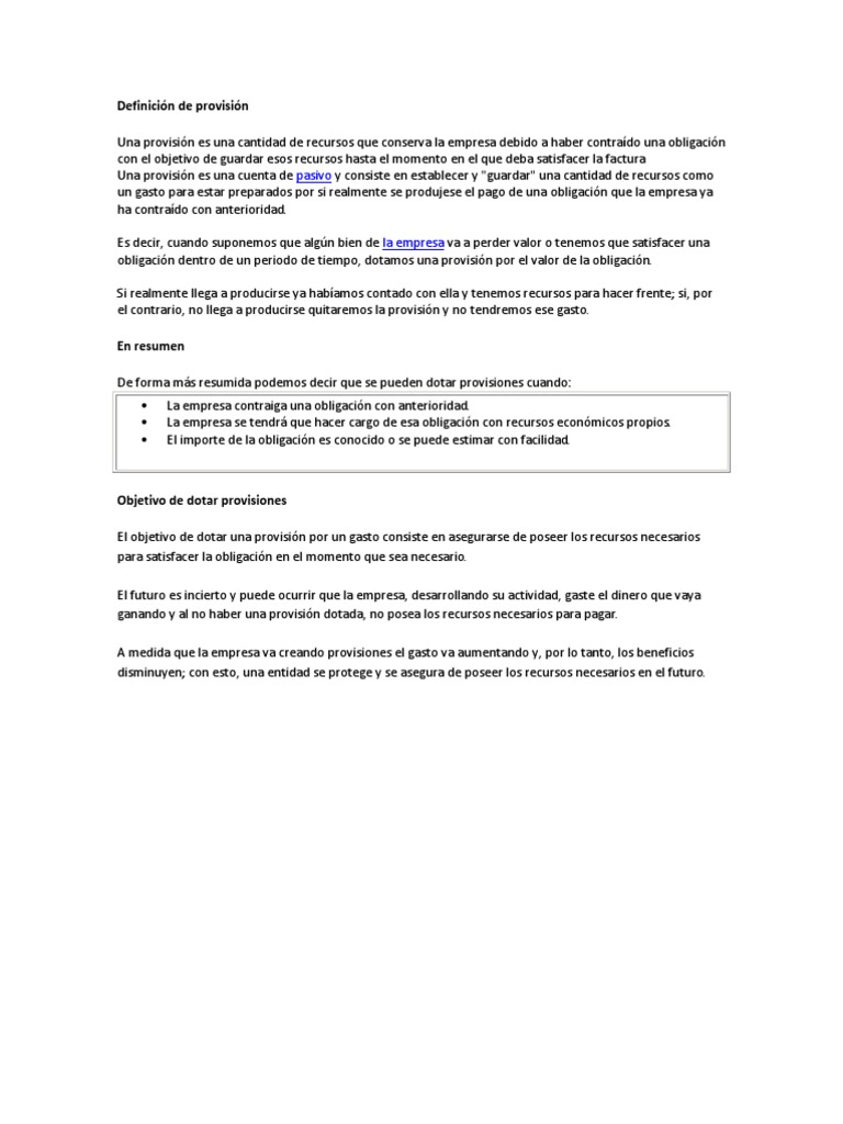 Definicin de provisin Una provisin es una cantidad de recursos que conserva la empresa debido a haber contrado una obligacin