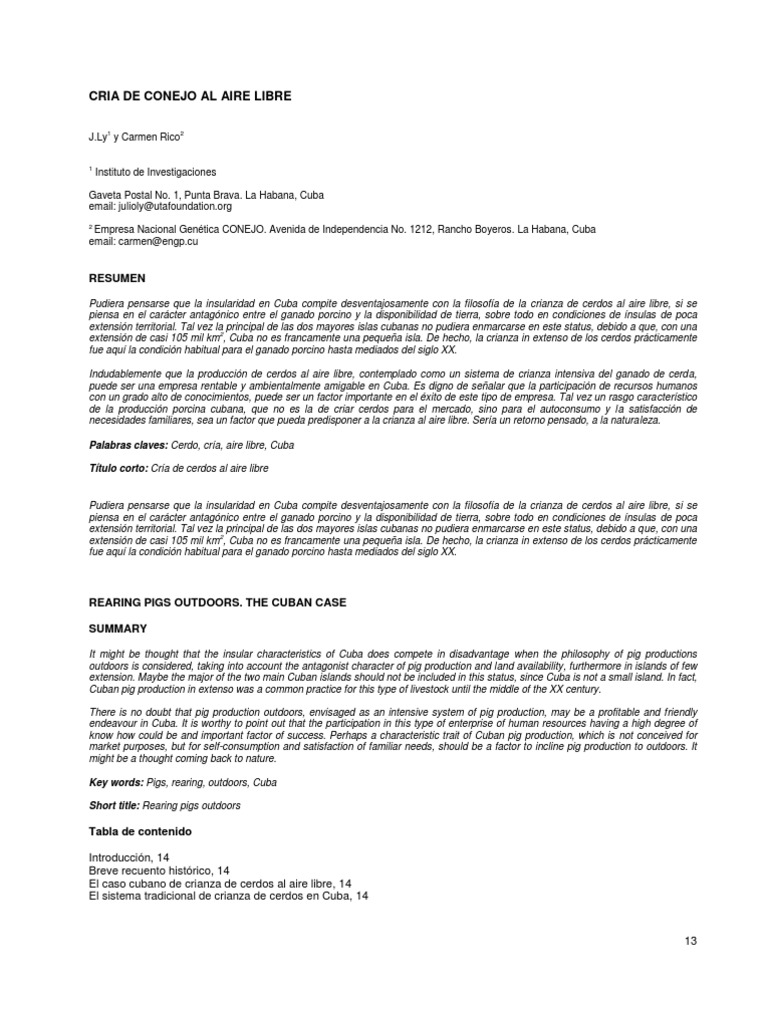 Tabla de contenido Introduccin, 14 Breve recuento histrico, 14 El caso cubano de crianza de cerdos al aire libre, 14 El sistema tradicional de crianza de cerdos en Cuba, 14