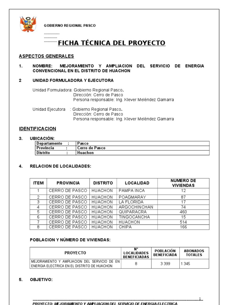 1. 2 NOMBRE: MEJORAMIENTO Y AMPLIACION CONVENCIONAL EN EL DISTRITO DE HUACHON UNIDAD FORMULADORA Y EJECUTORA Unidad Formuladora: Gobierno Regional Pasco . Direccin: Cerro de Pasco Persona responsable: Ing. Klever Melndez Gamarra Unidad Ejecutora : Gobierno Regional Pasco . Direccin: Cerro de Pasco Persona responsable: Ing. Klever Melndez Gamarra DEL SERVICIO DE ENERGIA