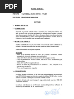 Localidades a electrificar Sistema Tensin Calificacin elctrica Factor de simultaneidad Numero de lotes(usuarios) Postes Conductor Vano promedio Vano mximo Alumbrado publico : Sistema de puesta a tierra Conexiones domiciliarias : : : : : : : : : Pampa Inca, Poagmaray, La Florida, Argochinchan, Quiparacra, Huachon, Chipa y Tingocancha Trifasico: 380-220 voltios Monofasico: 440-220 voltios 380-220 y 440-220 voltios. 300 vatios/ lote 0.5 para servicio domestico 1345 Postes de concreto 9m / 200 daN y 9 m / 300 daN Auto portantes de aleacin de aluminio, AAAC de 16, 25 y 35 mm de seccin. 38 metros. 110 metros 130 unidades de equipos constituidos por luminaria, pastoral y lmpara de 50 vatios Electrodo(s) vertical(es) de puesta a tierra con buzones de puesta a tierra. Armados PAT-1 cada 400 metros aproximadamente. 1345 conexiones domiciliarias monofsicas y trifsicas
