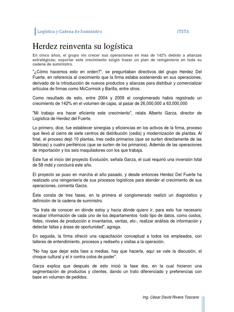 "El problema era que al principio quedbamos en hacer entregas en 24 horas y a nadie el cumplamos, terminbamos entregando a todos nuestros clientes a los cuatro das". Con esta segmentacin, Herdez logr una oferta de servicio por tipo de cliente. Entonces inici una programacin de compras, produccin y transportacin diferenciada por tipo de producto. El director de Logstica explica adems que una de las iniciativas en esta etapa fue hacer equipos de servicio por rea para integrar la estrategia comercial con la de suministro y produccin para resolver situaciones con clientes estratgicos. Tambin se cre un rea especial dedicada a cuestiones de planeacin de la demanda, la cual gira las rdenes para que las otras reas las ejecuten. Garza explica que una vez que se defini esto, lo siguiente fue echar a andar una prueba piloto con cinco marcas, "se hizo una modelacin de pronsticos y se capacit a los usuarios piloto; entonces empezamos a buscar una tecnologa que soportara esta operacin". Entonces inici la fase tres, enfocada en la optimizacin del proceso que ya haban iniciado; Herdez adquiri el ERP Demantra de Oracle y lo integr en siete semanas, con lo cual ha reducido en 6% el ndice de errores en informacin y ejecucin; incluso, se han alineado a los ERPs de clientes como Walmart y Soriana para controlar inventarios por producto. Garza seala con la nueva tecnologa pudieron incluir el resto de las marcas al plan de ventas y operaciones (POV) y lograron beneficios como reduccin en el manejo de archivos, mayor visibilidad del proceso y disminucin en el tiempo de clculo y arreglo de la informacin. Garza explica que los resultados de esta reingeniera logstica han contribuido en el crecimiento de 6% en los ingresos, adems del incremento en el volumen de operacin. "Antes de este proyecto lo estbamos haciendo bien, pero queramos seguir creciendo de manera eficiente", concluye.