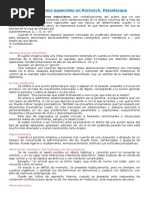 Fc: la impresin de textura se da en un objeto con una forma bien definida. Por ejemplo: perro lanudo (Lm III). cF: la sensacin de textura se da en un elemento con una forma vaga o poco [Link] ejemplo: rocas speras. c: en este caso, no hay ningn elemento formal, slo la sensacin de textura. Por ejemplo: blando. a) Efecto de Tridimencionalidad K En ellas, el sombreado da la impresin de profundidad y perspectiva (Ej: un castillo visto a lo lejos). Psicolgicamente, segn Klopfer, estn relacionadas con aspectos disfricos, con menor o mayor impacto ansioso en la medida que estn acompaadas de F. FK: a pesar de que estn dando cuenta de aspectos disfricos y ansiosos, indican un mayor autodominio, flexibilidad y una visin ms realista y conciente de la situacin. KF y K: ambos casos, a diferencia de las FK, dan cuenta de conflictos inhibitorios, rigidez, represin, y un menor ajuste conciente y realista frente a las situaciones. De este modo, junto al estado disfrico se presentan sentimientos de culpa y ansiedad relacionados con los propios impulsos inconcientes y descontrolados. Lgicamente, la angustia es mayor en K que en KF, debido a la falta de control lgico formal. b) Efecto de Bidimencionalidad k En ellas, el efecto de sombreado estimula la visin de un objeto que en la realidad es tridimensional, pero que es visto en un plano bidimensional. Por lo tanto, se usa k para tabulas respuestas de mapas y radiografas. Psicolgicamente, segn Klopfer, tambin dan cuenta de estados disfricos relacionados con niveles profundos de ansiedad y culpa, sin embargo, a diferencia de las tridimencionales, estas reflejan un manejo ms evasivo de la angustia. El sujeto realizara una tentativa intelectual para despersonalizar u objetivar la brumosidad sin