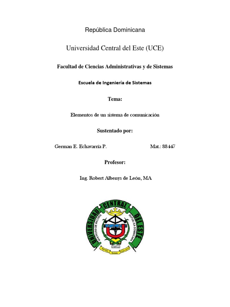Facultad de Ciencias Administrativas y de Sistemas Escuela de Ingeniera de Sistemas Tema: Elementos de un sistema de comunicacin Sustentado por: German E. Echavarra P. Profesor: Ing. Robert Albenys de Len, MA Mat.: 88447