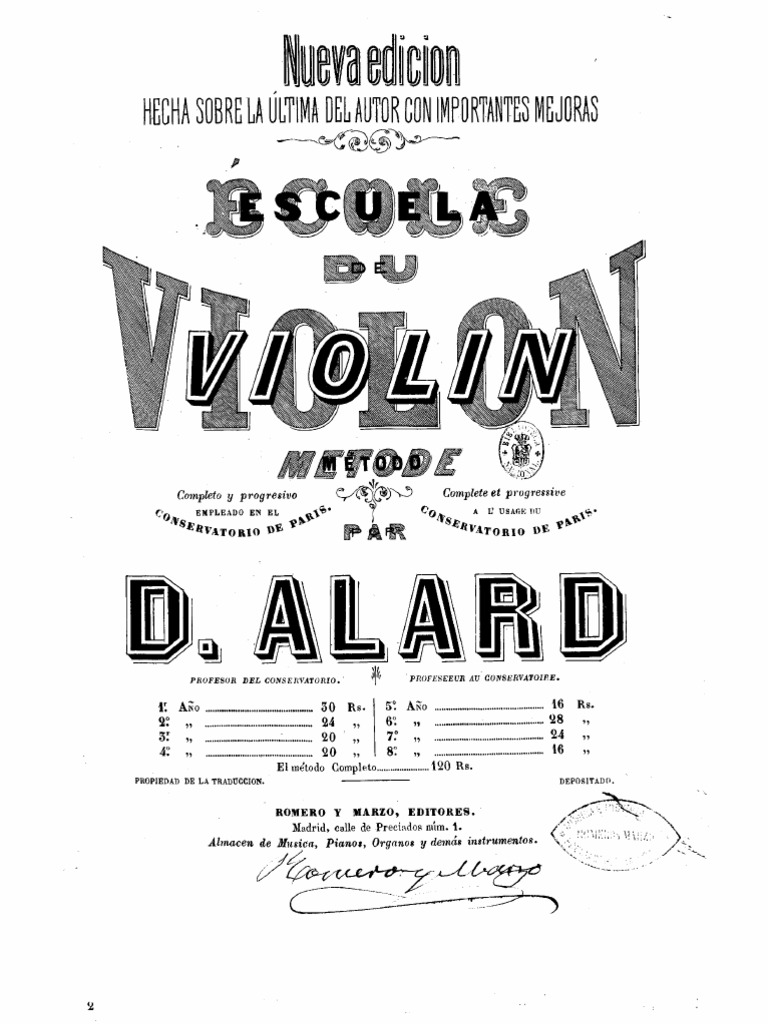 L a justa celebridad de que goza el Mtodo de Yiolin compuesto por el S o r . Delphin Alard como fundamento de su escuela, es debida sin duda al buen gusto que domina en todas sus lecciones, lo cual atena la arided de los .largos "estudios que es indispensable hacer para llegar a ser un buen violinista. P o r esta razn y por otras no menos atendibles fu adoptado hace auos y contina sirviendo de base p a r a la Escuela de Msica y declamacin de Madrid. Las indicaciones que el Sor. Alard hace en varios prrafos de la segunda edicin de dicha obra autorizando a los profesores para que anticipen o retrasen el estudio de algunas materias, y las circunstancias especiales de la mencionada Escuela, la que concurre gran nmero de alumnos y en la que para regularizar la marcha de la enseanza se divide esta en anos escolares, han decidido al Sor Don Jess de Monasterio, profesor numerario de la clase de Yiolin, a invertir el orden en ciertos casos y a establecer el que, fundado en su larga experiencia e incesantes observaciones, ha creido ms conteniente y progresivo, determinando las materias que deben estudiarse en cada ao escolar sobre las que versan los examenes respectivos, e intercalando oportunamente el estudio de ciertos ejercicios escalas y de otros ge'neros reconocidos umversalmente como tilsimos,y algunos d e q u e los mtodos. Habiendo yo presenciado durante muchos aos los brillantsimos resultados que ha dado la esmerada e' inteligente direccin del Sol', de Monasterio, y deseando que tambin aprovechen de ella los que, por residir fuera de Madrid o' por otras causas, no pueden recibir directamente lecciones' de tan concienzudo profesor, he resuelto hacer la p r e sente edicin dispuesta en la forma que prescribe el programa adoptado en la antedicha Escuela y aprobado por la Direccin de la misma, dividiendo esta enseanza en ocho aos escolares; y deseando dar al autor una prueba de consideracin he conservado el texto francs y hecho por m mismo la traduccin espaola, con la desinteresada y eficaz cooperacin del Sor. D . Rafael P r e z , profesor ausiliar de violin de dicha Escuela; indicando en los sitios convenientes, bajo el epgrafe de Recomendacin los estudios que deben intercalarse en el curso del Mtodo, por cuyo medio Madrid. los que estudien con esta nueva edicin tendrn como guia de sus futuros adelantos la obra completa del c l e b r e . Alard segn se practica en la Escuela de Msica y Declamacin de no se hace mecion de en la enseanza de dicho instrumento en