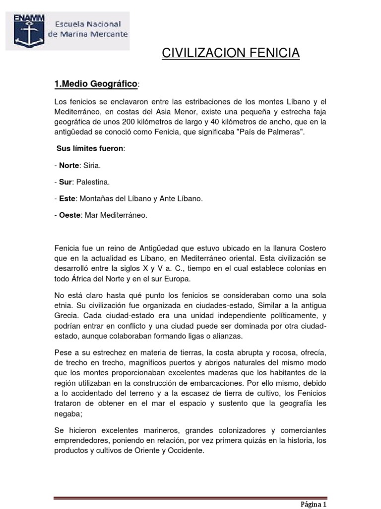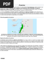 Fenicia fue un reino de Antigedad que estuvo ubicado en la llanura Costero que en la actualidad es Lbano, en Mediterrneo oriental. Esta civilizacin se desarroll entre la siglos X y V a. C., tiempo en el cual establece colonias en todo frica del Norte y en el sur Europa. No est claro hasta qu punto los fenicios se consideraban como una sola etnia. Su civilizacin fue organizada en ciudades-estado, Similar a la antigua Grecia. Cada ciudad-estado era una unidad independiente polticamente, y podran entrar en conflicto y una ciudad puede ser dominada por otra ciudadestado, aunque colaboraban formando ligas o alianzas. Pese a su estrechez en materia de tierras, la costa abrupta y rocosa, ofreca, de trecho en trecho, magnficos puertos y abrigos naturales del mismo modo que los montes proporcionaban excelentes maderas que los habitantes de la regin utilizaban en la construccin de embarcaciones. Por ello mismo, debido a lo accidentado del terreno y a la escasez de tierra de cultivo, los Fenicios trataron de obtener en el mar el espacio y sustento que la geografa les negaba; Se hicieron excelentes marineros, grandes colonizadores y comerciantes emprendedores, poniendo en relacin, por vez primera quizs en la historia, los productos y cultivos de Oriente y Occidente.