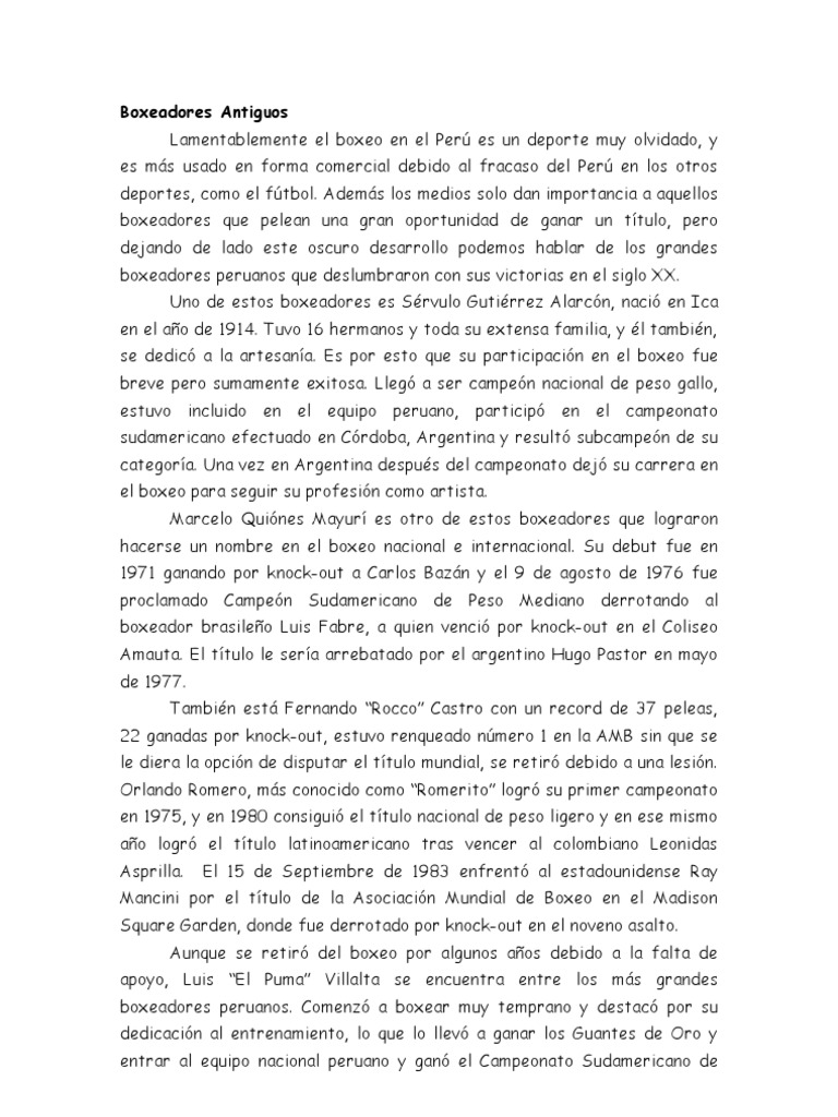 Boxeadores Antiguos Lamentablemente el boxeo en el Per es un deporte muy olvidado, y es ms usado en forma comercial debido al fracaso del Per