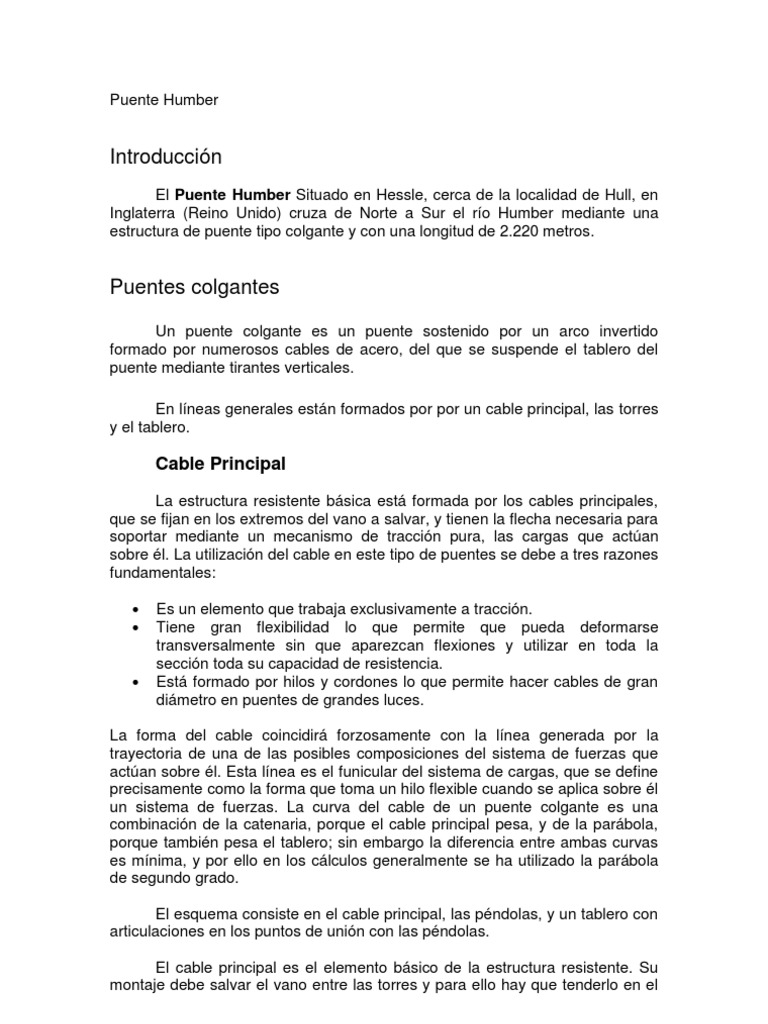 Un puente colgante es un puente sostenido por un arco invertido formado por numerosos cables de acero, del que se suspende el tablero del puente mediante tirantes verticales. En lneas generales estn formados por por un cable principal, las torres y el tablero.