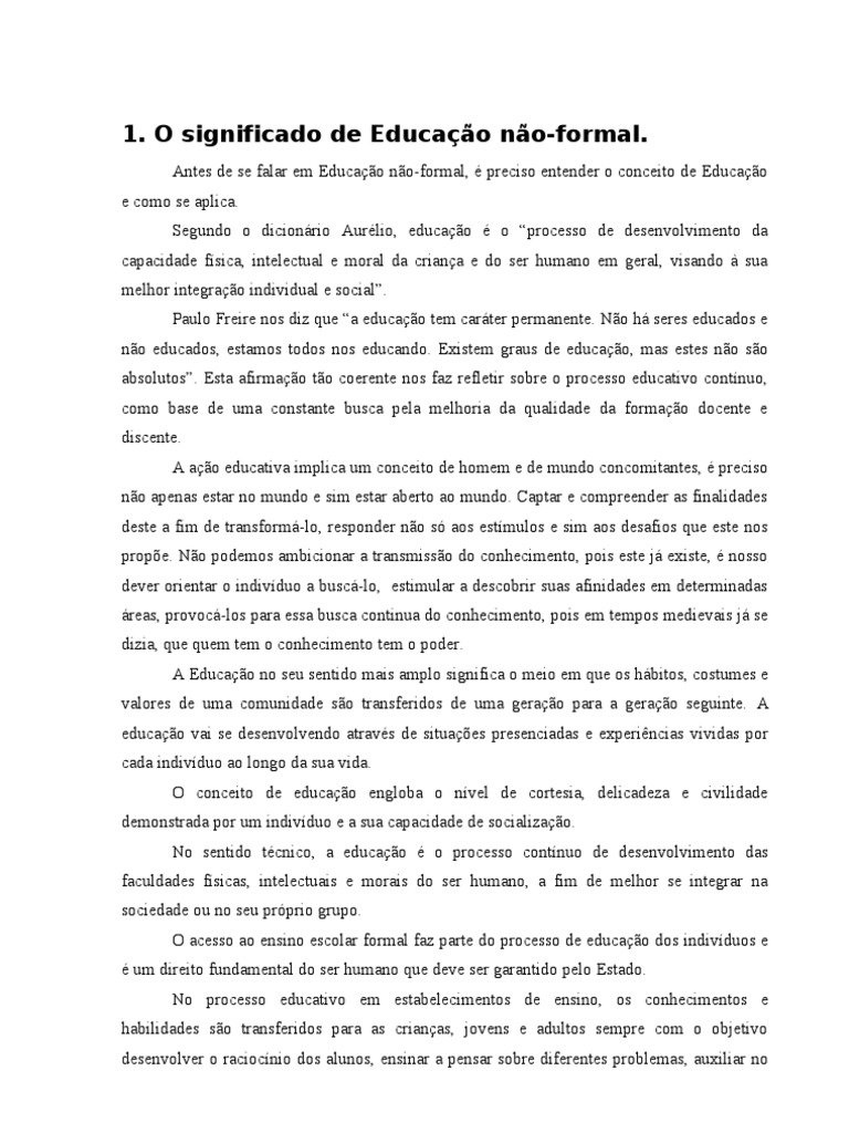 Antes de se falar em Educao no-formal, preciso entender o conceito de Educao e como se aplica. Segundo o dicionrio Aurlio, educao o processo de desenvolvimento da capacidade fsica, intelectual e moral da criana e do ser humano em geral, visando sua melhor integrao individual e social. Paulo Freire nos diz que a educao tem carter permanente. No h seres educados e no educados, estamos todos nos educando. Existem graus de educao, mas estes no so absolutos. Esta afirmao to coerente nos faz refletir sobre o processo educativo contnuo, como base de uma constante busca pela melhoria da qualidade da formao docente e discente. A ao educativa implica um conceito de homem e de mundo concomitantes, preciso no apenas estar no mundo e sim estar aberto ao mundo. Captar e compreender as finalidades deste a fim de transform-lo, responder no s aos estmulos e sim aos desafios que este nos prope. No podemos ambicionar a transmisso do conhecimento, pois este j existe, nosso dever orientar o indivduo a busc-lo, estimular a descobrir suas afinidades em determinadas reas, provoc-los para essa busca continua do conhecimento, pois em tempos medievais j se dizia, que quem tem o conhecimento tem o poder. A Educao no seu sentido mais amplo significa o meio em que os hbitos, costumes e valores de uma comunidade so transferidos de uma gerao para a gerao seguinte. A educao vai se desenvolvendo atravs de situaes presenciadas e experincias vividas por cada indivduo ao longo da sua vida. O conceito de educao engloba o nvel de cortesia, delicadeza e civilidade demonstrada por um indivduo e a sua capacidade de socializao. No sentido tcnico, a educao o processo contnuo de desenvolvimento das faculdades fsicas, intelectuais e morais do ser humano, a fim de melhor se integrar na sociedade ou no seu prprio grupo. O acesso ao ensino escolar formal faz parte do processo de educao dos indivduos e um direito fundamental do ser humano que deve ser garantido pelo Estado. No processo educativo em estabelecimentos de ensino, os conhecimentos e habilidades so transferidos para as crianas, jovens e adultos sempre com o objetivo desenvolver o raciocnio dos alunos, ensinar a pensar sobre diferentes problemas, auxiliar no