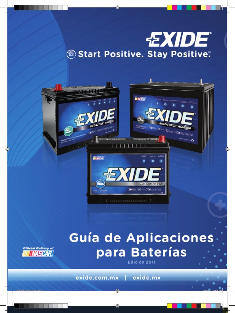 Informacin de producto . . . . . . . . . . . . . . . . . . . . . . . . . . . . . . . . . . . . . . . . . . . . . . . . . . 2 Especificaciones de bateras Exide . . . . . . . . . . . . . . . . . . . . . . . . . . . . . . . . . . . . . . . . . 6 Configuraciones de postes/terminales BCI . . . . . . . . . . . . . . . . . . . . . . . . . . . . . . . . . . 9 Diagramas por cdigo BCI, distribucin de celdas, sujeciones y polaridad . . . . . . 10 Tabla de referencias BCI / DIN / EN . . . . . . . . . . . . . . . . . . . . . . . . . . . . . . . . . . . . . . . . 13 Tabla de referencias BCI / JIS . . . . . . . . . . . . . . . . . . . . . . . . . . . . . . . . . . . . . . . . . . . . . . 14 Bateras descontinuadas . . . . . . . . . . . . . . . . . . . . . . . . . . . . . . . . . . . . . . . . . . . . . . . . . . 15 Tabla de valores de las bateras Exide de ciclo profundo . . . . . . . . . . . . . . . . . . . . . . 15 Tabla de cruces de referencia Exide por grupo BCI . . . . . . . . . . . . . . . . . . . . . . . . . . . 16 Diagramas de bateras y conexin de cables . . . . . . . . . . . . . . . . . . . . . . . . . . . . . . . . 17 Para verificar las condiciones de la batera . . . . . . . . . . . . . . . . . . . . . . . . . . . . . . . . . . 18 Instrucciones para cargar una batera . . . . . . . . . . . . . . . . . . . . . . . . . . . . . . . . . . . . . . 19 Tiempo de recarga de las bateras . . . . . . . . . . . . . . . . . . . . . . . . . . . . . . . . . . . . . . . . 20 Glosario de trminos . . . . . . . . . . . . . . . . . . . . . . . . . . . . . . . . . . . . . . . . . . . . . . . . . . . . . 21 Lo que se debe hacer y lo que no se debe hacer con una batera . . . . . . . . . . . . . 22 Tabla de aplicacin por vehculo . . . . . . . . . . . . . . . . . . . . . . . . . . . . . . . . . . . . . . . . . . 23 Tabla de aplicacin por batera . . . . . . . . . . . . . . . . . . . . . . . . . . . . . . . . . . . . . . . . . . . 33 Tabla de aplicacin para bateras de equipo pesado . . . . . . . . . . . . . . . . . . . . . . . . . 42 Tabla de aplicacin para bateras de construccin . . . . . . . . . . . . . . . . . . . . . . . . . . 45 Tabla de aplicacin para bateras agrcolas . . . . . . . . . . . . . . . . . . . . . . . . . . . . . . . . . 52 Tabla de aplicacin para bateras marnas . . . . . . . . . . . . . . . . . . . . . . . . . . . . . . . . . . 56 Tabla de aplicacin para bateras de golf . . . . . . . . . . . . . . . . . . . . . . . . . . . . . . . . . . . 56 Tabla de aplicacin para bateras de jardinera . . . . . . . . . . . . . . . . . . . . . . . . . . . . . . 56 Tabla de intercambios de bateras automotrices . . . . . . . . . . . . . . . . . . . . . . . . . . . . 57 Tabla de intercambios de bateras - Equipo pesado / Agrcolas / Construccin / Jardinera / Golf . . . . . . . . . . . . . . . . . . . . . . . . . . . . . . . . . . . . . . . . . . 59