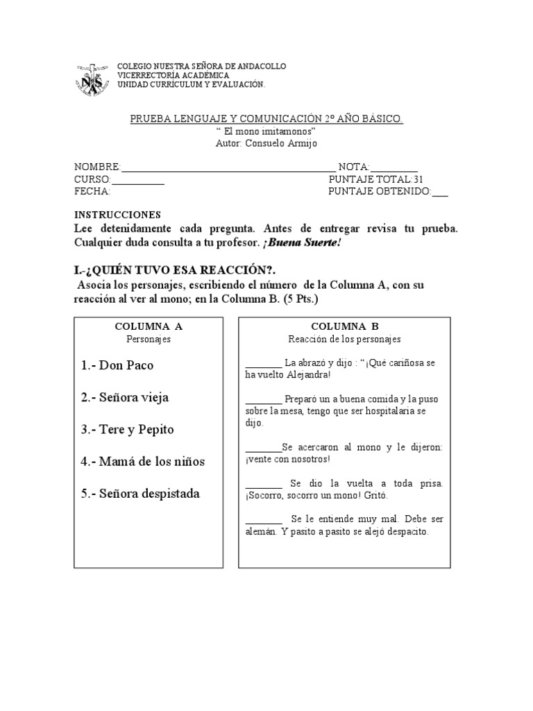 reaccin al ver al mono; en la Columna B. (5 Pts.)