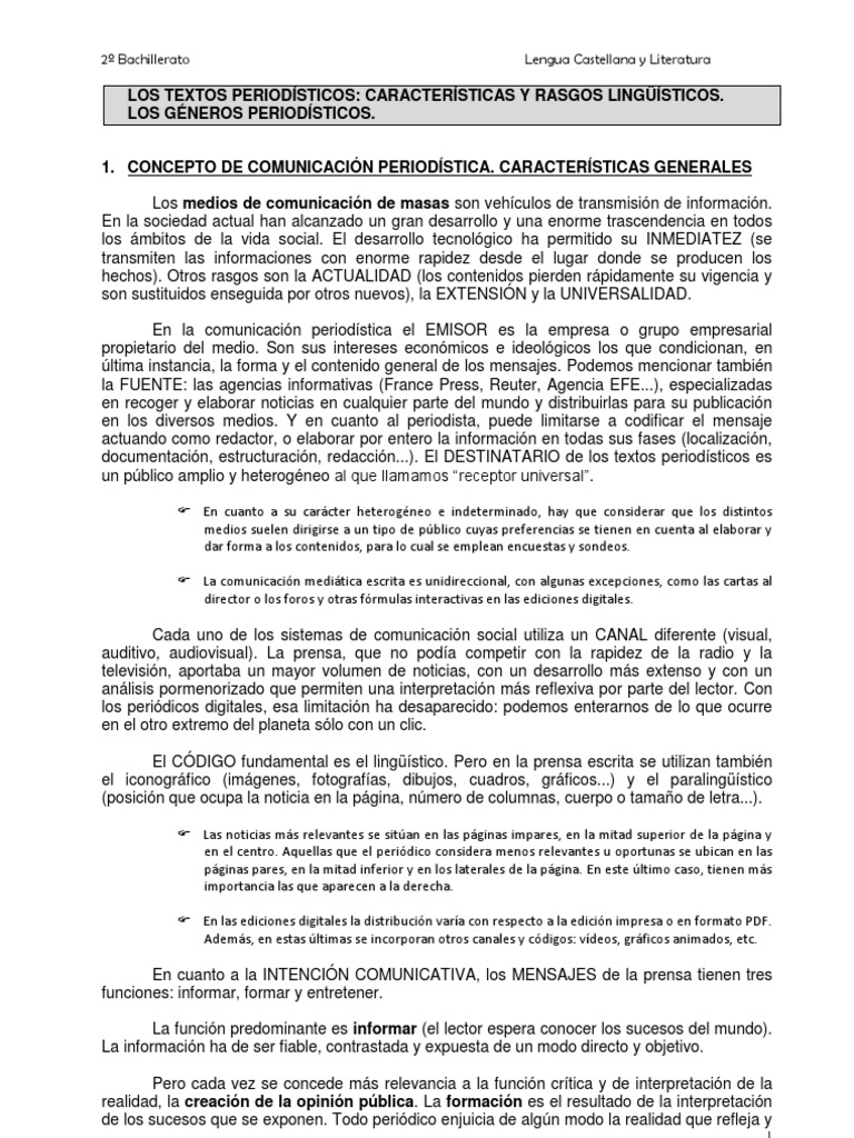 LOS TEXTOS PERIODSTICOS: CARACTERSTICAS Y RASGOS LINGSTICOS. LOS GNEROS PERIODSTICOS. 1. CONCEPTO DE COMUNICACIN PERIODSTICA. CARACTERSTICAS GENERALES Los medios de comunicacin de masas son vehculos de transmisin de informacin. En la sociedad actual han alcanzado un gran desarrollo y una enorme trascendencia en todos los mbitos de la vida social. El desarrollo tecnolgico ha permitido su INMEDIATEZ (se transmiten las informaciones con enorme rapidez desde el lugar donde se producen los hechos). Otros rasgos son la ACTUALIDAD (los contenidos pierden rpidamente su vigencia y son sustituidos enseguida por otros nuevos), la EXTENSIN y la UNIVERSALIDAD. En la comunicacin periodstica el EMISOR es la empresa o grupo empresarial propietario del medio. Son sus intereses econmicos e ideolgicos los que condicionan, en ltima instancia, la forma y el contenido general de los mensajes. Podemos mencionar tambin la FUENTE: las agencias informativas (France Press, Reuter, Agencia EFE...), especializadas en recoger y elaborar noticias en cualquier parte del mundo y distribuirlas para su publicacin en los diversos medios. Y en cuanto al periodista, puede limitarse a codificar el mensaje actuando como redactor, o elaborar por entero la informacin en todas sus fases (localizacin, documentacin, estructuracin, redaccin...). El DESTINATARIO de los textos periodsticos es un pblico amplio y heterogneo al que llamamos receptor universal.