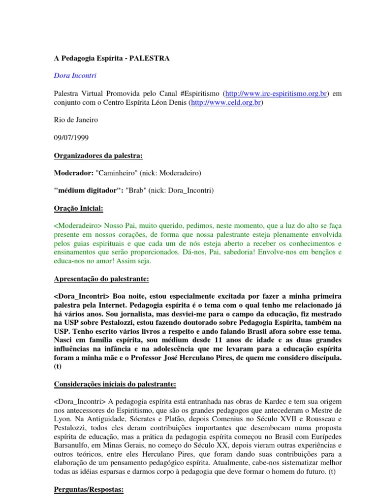 br) em conjunto com o Centro Esprita Lon Denis (http://www.celd.org.br) Rio de Janeiro 09/07/1999 Organizadores da palestra: Moderador: "Caminheiro" (nick: Moderadeiro) "mdium digitador": "Brab" (nick: Dora_Incontri) Orao Inicial: <Moderadeiro> Nosso Pai, muito querido, pedimos, neste momento, que a luz do alto se faa presente em nossos coraes, de forma que nossa palestrante esteja plenamente envolvida pelos guias espirituais e que cada um de ns esteja aberto a receber os conhecimentos e ensinamentos que sero proporcionados. D-nos, Pai, sabedoria! Envolve-nos em benos e educa-nos no amor! Assim seja. Apresentao do palestrante: <Dora_Incontri> Boa noite, estou especialmente excitada por fazer a minha primeira palestra pela Internet. Pedagogia esprita o tema com o qual tenho me relacionado j h vrios anos. Sou jornalista, mas desviei-me para o campo da educao, fiz mestrado na USP sobre Pestalozzi, estou fazendo doutorado sobre Pedagogia Esprita, tambm na USP. Tenho escrito vrios livros a respeito e ando falando Brasil afora sobre esse tema. Nasci em famlia esprita, sou mdium desde 11 anos de idade e as duas grandes influncias na infncia e na adolescncia que me levaram para a educao esprita foram a minha me e o Professor Jos Herculano Pires, de quem me considero discpula. (t) Consideraes iniciais do palestrante: <Dora_Incontri> A pedagogia esprita est entranhada nas obras de Kardec e tem sua origem nos antecessores do Espiritismo, que so os grandes pedagogos que antecederam o Mestre de Lyon. Na Antiguidade, Scrates e Plato, depois Comenius no Sculo XVII e Rousseau e Pestalozzi, todos eles deram contribuies importantes que desembocam numa proposta esprita de educao, mas a prtica da pedagogia esprita comeou no Brasil com Eurpedes Barsanulfo, em Minas Gerais, no comeo do Sculo XX, depois vieram outras experincias e outros tericos, entre eles Herculano Pires, que foram dando suas contribuies para a elaborao de um pensamento pedaggico esprita. Atualmente, cabe-nos sistematizar melhor todas as idias esparsas e darmos corpo pedagogia que deve formar o homem do futuro. (t) Perguntas/Respostas: