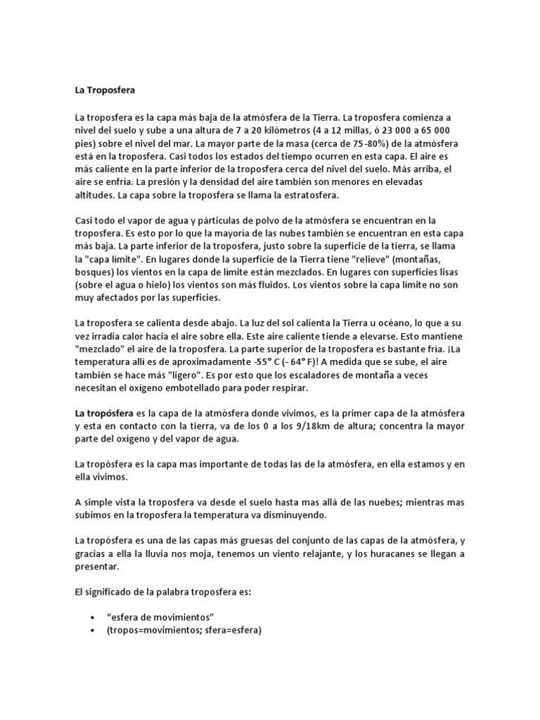 La troposfera comienza a nivel del suelo y sube a una altura de 7 a 20 kilmetros (4 a 12 millas, 23 000 a 65 000 pies) sobre el nivel del mar. La mayor parte de la masa (cerca de 75-80%) de la atmsfera est en la troposfera. Casi todos los estados del tiempo ocurren en esta capa. El aire es ms caliente en la parte inferior de la troposfera cerca del nivel del suelo. Ms arriba, el aire se enfra. La presin y la densidad del aire tambin son menores en elevadas altitudes. La capa sobre la troposfera se llama la estratosfera. Casi todo el vapor de agua y prticulas de polvo de la atmsfera se encuentran en la troposfera. Es esto por lo que la mayora de las nubes tambin se encuentran en esta capa ms baja. La parte inferior de la troposfera, justo sobre la superficie de la tierra, se llama la "capa lmite". En lugares donde la superficie de la Tierra tiene "relieve" (montaas, bosques) los vientos en la capa de lmite estn mezclados. En lugares con superficies lisas (sobre el agua o hielo) los vientos son ms fluidos. Los vientos sobre la capa lmite no son muy afectados por las superficies. La troposfera se calienta desde abajo. La luz del sol calienta la Tierra u ocano, lo que a su vez irradia calor hacia el aire sobre ella. Este aire caliente tiende a elevarse. Esto mantiene "mezclado" el aire de la troposfera. La parte superior de la troposfera es bastante fra. La temperatura all es de aproximadamente -55 C (- 64 F)! A medida que se sube, el aire tambin se hace ms "ligero". Es por esto que los escaladores de montaa a veces necesitan el oxgeno embotellado para poder respirar. La tropsfera es la capa de la atmsfera donde vivimos, es la primer capa de la atmsfera y esta en contacto con la tierra, va de los 0 a los 9/18km de altura; concentra la mayor parte del oxgeno y del vapor de agua. La tropsfera es la capa mas importante de todas las de la atmsfera, en ella estamos y en ella vivimos. A simple vista la troposfera va desde el suelo hasta mas all de las nuebes; mientras mas subimos en la troposfera la temperatura va disminuyendo. La tropsfera es una de las capas ms gruesas del conjunto de las capas de la atmsfera, y gracias a ella la lluvia nos moja, tenemos un viento relajante, y los huracanes se llegan a presentar. El significado de la palabra troposfera es: