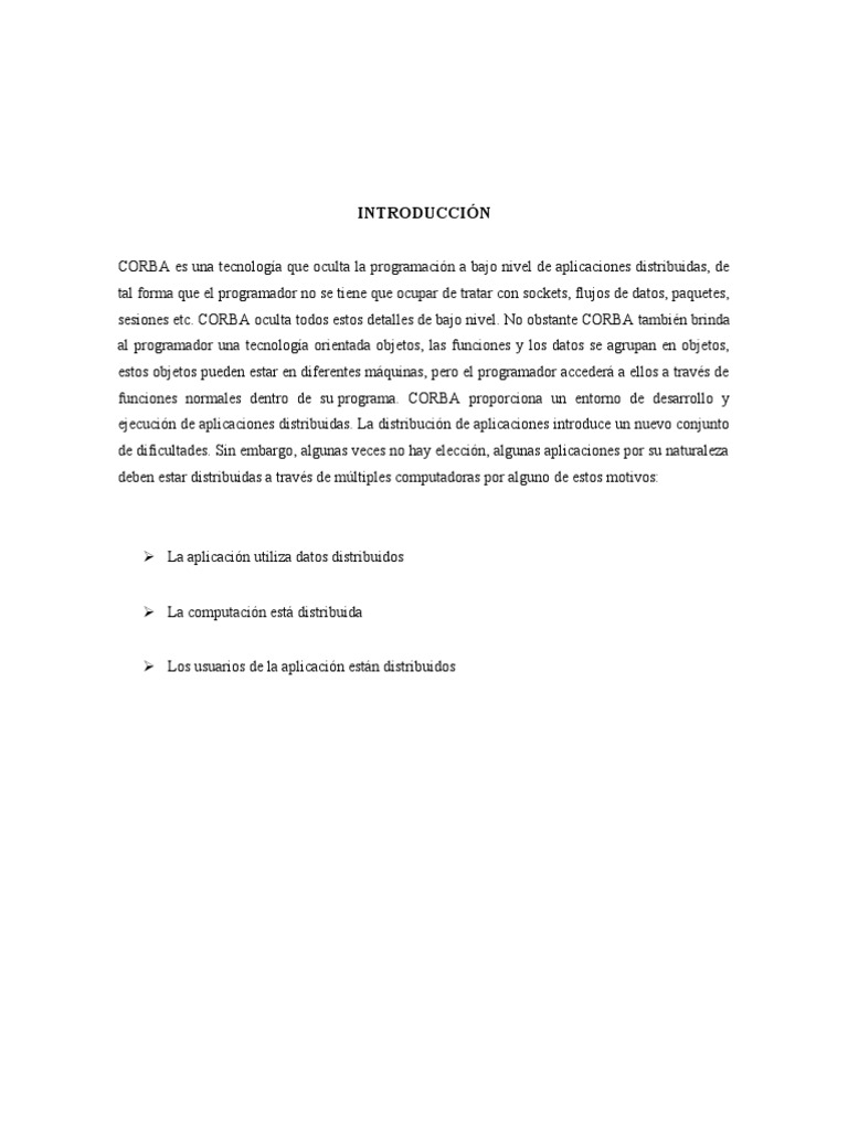 CORBA es una tecnologa que oculta la programacin a bajo nivel de aplicaciones distribuidas, de tal forma que el programador no se tiene que ocupar de tratar con sockets, flujos de datos, paquetes, sesiones etc. CORBA oculta todos estos detalles de bajo nivel. No obstante CORBA tambin brinda al programador una tecnologa orientada objetos, las funciones y los datos se agrupan en objetos, estos objetos pueden estar en diferentes mquinas, pero el programador acceder a ellos a travs de funciones normales dentro de su programa. CORBA proporciona un entorno de desarrollo y ejecucin de aplicaciones distribuidas. La distribucin de aplicaciones introduce un nuevo conjunto de dificultades. Sin embargo, algunas veces no hay eleccin, algunas aplicaciones por su naturaleza deben estar distribuidas a travs de mltiples computadoras por alguno de estos motivos: