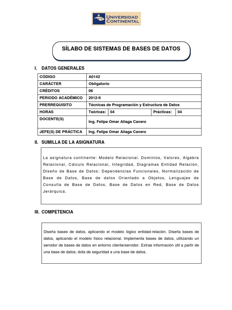 La as i gn a tur a c on t i ne nt e: M o de l o R e l ac i o n a l. D om in ios , V a lor es , A lg e br a Re l ac io n al , C l c u l o R e lac i on a l, I n te gr i da d, Di a gr am as E n ti d ad R e lac i n , Dis e o d e B as e de D at os : D e pe n de nc i as F unc i o na l es , N or m al i za c i n d e B as e d e D at os , B as e d e d a tos O r i e nt ad o a O bj e t os , Le n gu a j es d e Co ns ul t a de Bas e d e D at os , Bas e d e Da t os en R e d, Bas e d e D at os J er r q u ic a .