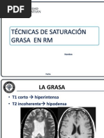SECUENCIAS DE SUPRESIN DE GRASA Existen 2 tipos: secuencias STIR (Short Time Inversion-Recovery) y secuencias FAT SAT. En la secuencia STIR se suprime la grasa mediante la aplicacin de un pulso inversor de 180 que invierte la magnetizacin longitudinal antes de que acte el pulso de 90 y 180. El pulso inversor es de 120 a 150 mseg. y anula o satura la grasa. La tcnica FAT SAT se usa en cualquier tipo de secuencia SE, EG y secuencia SE rpida potenciadas en T1 T2, y consiste en la aplicacin de un pulso previo de inversin, pero esta vez de banda estrecha en la frecuencia de resonancia de la grasa, (supresin espectral) que slo suprima la grasa, quedando el agua sin alterarse lo ms mnimo. Son secuencias muy buenas para el screning de la patologa musculoesqueltica, pero no para obtener imgenes de calidad que permitan una visualizacin de la anatoma y una caracterizacin de la patologa.