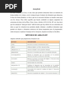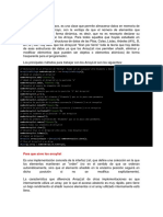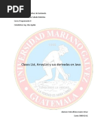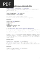 ArrayList Un ArrayList es un array dinmico. No tiene restricciones de capacidad. Su tamao se ajusta de forma dinmica. Constructor por defecto: new ArrayList(). Inicialmente, la capacidad de un ArrayList creado as es 0. Los elementos dentro de un ArrayList son Objetos. No pueden ser de tipo bsico, pero pueden ser de cualquier tipo de objeto. La clase ArrayList forma parte del paquete [Link] Para poner un elemento dentro de esta estructura, usamos el mtodo add y para recoger un elemento usamos el mtodo get. Ejemplo: import [Link].*; public class ArrayListExample1 { public static void main(String[ ] args) { ArrayList thisArrayList = new ArrayList( ) ; [Link]("hello" ; [Link](","; [Link]("are" ; [Link]("you" ; [Link]("?" ; for (int i=0;i<"[Link]( ) " ;i++) [Link]([Link](i) + " " ) ; } } Mtodos de ArrayList int size() -- El tamao actual (puede ser 0) void add(obj) -- Aade un objeto al final del ArrayList, incrementando su tamao de 1. obj es un objeto. Object get(N) -- Devuelve el elemento almacenado a la posicin N en el ArrayList. N tiene que ser un entero entre 0 y size()-1. En [Link], se convierte el objeto devuelto por get() a un Integer con casting. En [Link], se convierte el objeto devuelto por get() a un String llamando al mtodo toString() de Object. -----Analizar import [Link]; public class ArrayListInteger { public static void main(String[] args) { ArrayList numeros = new ArrayList() ; Integer num1 = new Integer(10); Integer num2 = new Integer(20) ; Integer num3 = new Integer(30) ;