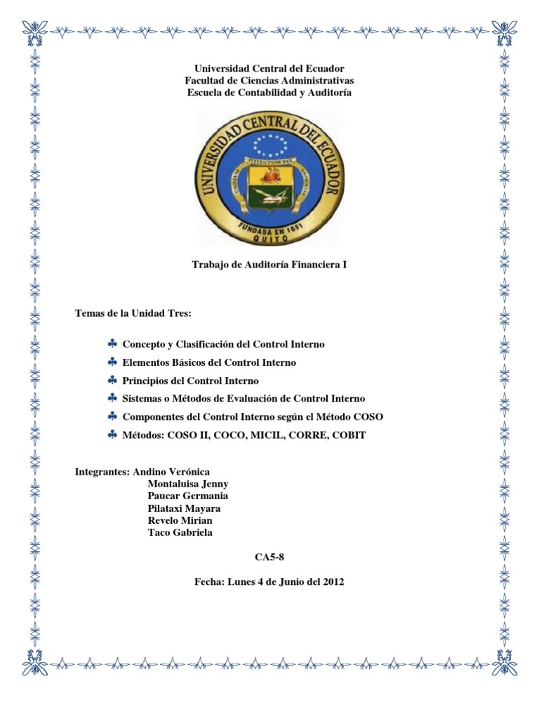 COMENTARIO Debido al mundo econmico integrado que existe hoy en da se ha creado la necesidad de integrar metodologas y conceptos en todos los niveles de las diversas reas administrativas y operativas con el fin de ser competitivos y responder a las nuevas exigencias empresariales, surge as un nuevo concepto de control interno donde se brindan varias estructuras en el cual hemos consultado los siguientes: COSO I y II, COCO, CORRE, MICIL, COBIT
