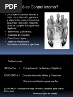 DEFINICIN EL Control interno puede definirse como un conjunto de procedimientos, poltica, directrices y planes de organizacin los cuales tienen por objeto asegurar una eficiencia, seguridad y orden en la gestin financiera, contable y administrativa de la empresa. El control interno la permite a la empresa: Proteger sus activos. Proteger a la empresa en contra del mal uso de los activos. Evitar que se incurra indebidamente en pasivos. Asegurar la exactitud y la confiabilidad de toda la informacin financiera y de operacin. Evaluar la eficiencia en las operaciones. Cerciorase que ha habido una adhesin a la poltica que tenga establecida la contabilidad. El control Interno incluye toda la organizacin, los mecanismos, mtodos y medidas que se disean, implantan y mantienen para asegurar que se logran los objetivos, y que cumplan con las funciones y tareas relacionadas con la previsin, seguimiento y control de las actividades econmicas, financieras y administrativas, la proteccin y conservacin de los recursos disponibles y el medio ambiente, de tal manera que sus resultados sean factibles de medirse y comprobarse, tanto en lo relativo a los hechos o acontecimientos propiamente dichos como los actos de quienes intervienen en ellos. Control interno es un proceso: Diseado y efectuado por quienes tienen a cargo el gobierno, la administracin y otro personal; y Que tiene la intencin de dar seguridad razonable sobre el logro de los objetivos de la entidad con relacin a la confiabilidad de la informacin financiera, la efectividad y la eficiencia de las operaciones, y el cumplimiento con las leyes y regulaciones aplicables.