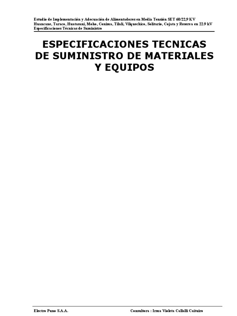 Estudio de Implementacin y Adecuacin de Alimentadores en Media Tensin SET 60/22,9 KV Huancane, Taraco, Huatasani, Moho, Conima, Tilali, Vilquechico, Solitario, Cojata y Reserva en 22.9 kV Especificaciones Tcnicas de Suministro