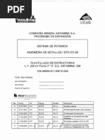 Las otras dimensiones as como la configuracin fsica, se muestran en las lminas adjuntas. Cada varilla deber ser suministrada con una tuerca cuadrada y una contratuerca cuadrada de doble concavidad, las que estarn debidamente ensambladas a la varilla. 4.2.1.2 Arandela cuadrada para anclaje Ser de acero galvanizado en caliente y tendr 102 mm de lado y 5 mm de espesor. Estar provista de un agujero central de 20 mm de dimetro. Deber ser diseada y fabricada para soportar los esfuerzos de corte por presin de la tuerca de 71 kN. 4.2.1.3 Abrazadera de Platina de FoGo