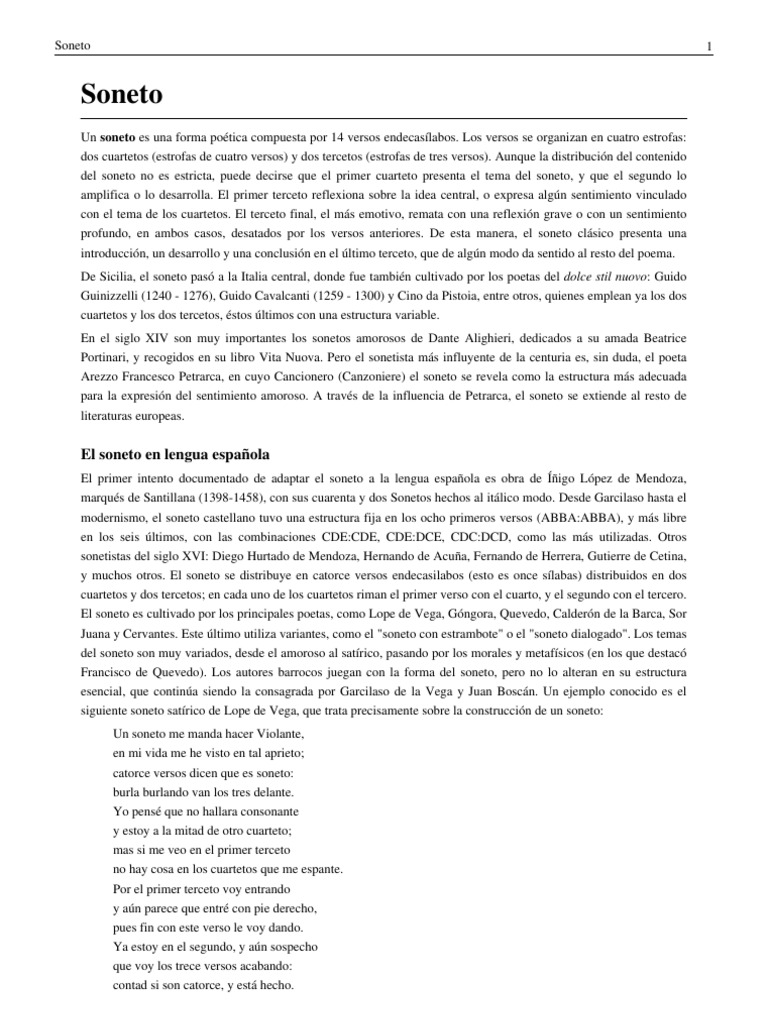 Un soneto es una forma potica compuesta por 14 versos endecaslabos. Los versos se organizan en cuatro estrofas: dos cuartetos (estrofas de cuatro versos) y dos tercetos (estrofas de tres versos). Aunque la distribucin del contenido del soneto no es estricta, puede decirse que el primer cuarteto presenta el tema del soneto, y que el segundo lo amplifica o lo desarrolla. El primer terceto reflexiona sobre la idea central, o expresa algn sentimiento vinculado con el tema de los cuartetos. El terceto final, el ms emotivo, remata con una reflexin grave o con un sentimiento profundo, en ambos casos, desatados por los versos anteriores. De esta manera, el soneto clsico presenta una introduccin, un desarrollo y una conclusin en el ltimo terceto, que de algn modo da sentido al resto del poema. De Sicilia, el soneto pas a la Italia central, donde fue tambin cultivado por los poetas del dolce stil nuovo: Guido Guinizzelli (1240 - 1276), Guido Cavalcanti (1259 - 1300) y Cino da Pistoia, entre otros, quienes emplean ya los dos cuartetos y los dos tercetos, stos ltimos con una estructura variable. En el siglo XIV son muy importantes los sonetos amorosos de Dante Alighieri, dedicados a su amada Beatrice Portinari, y recogidos en su libro Vita Nuova. Pero el sonetista ms influyente de la centuria es, sin duda, el poeta Arezzo Francesco Petrarca, en cuyo Cancionero (Canzoniere) el soneto se revela como la estructura ms adecuada para la expresin del sentimiento amoroso. A travs de la influencia de Petrarca, el soneto se extiende al resto de literaturas europeas.