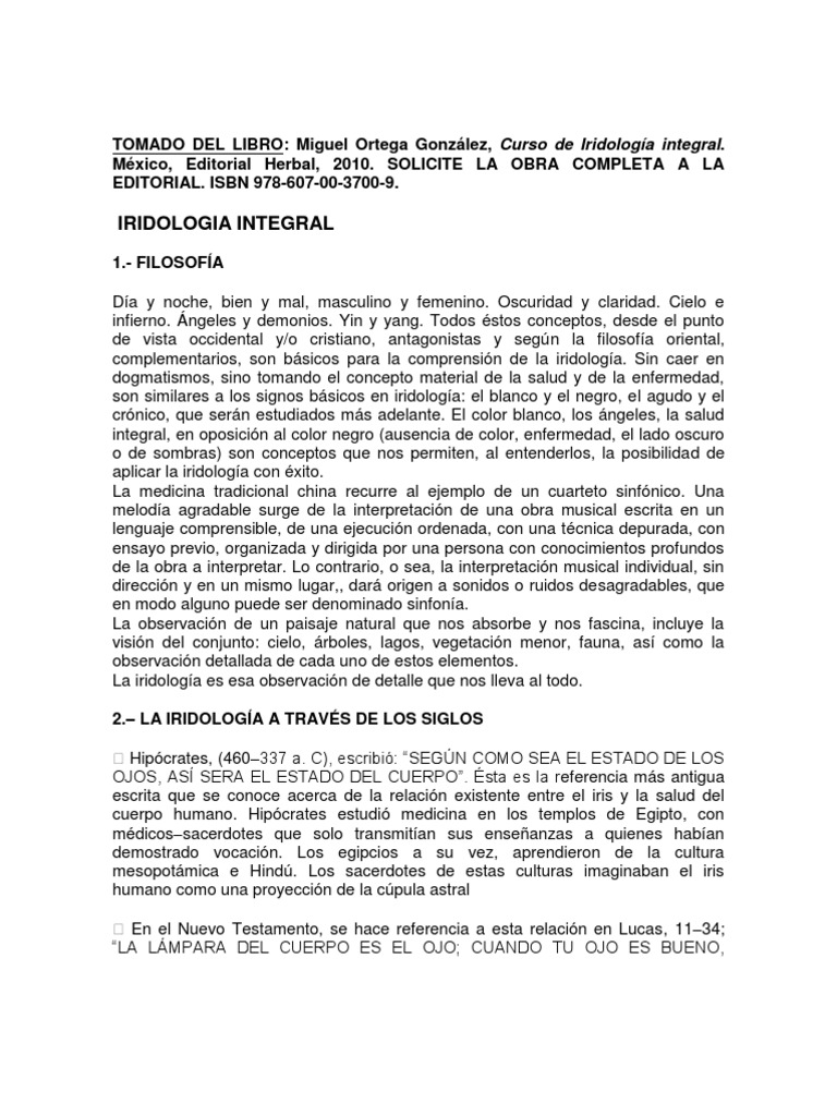 1.- FILOSOFA Da y noche, bien y mal, masculino y femenino. Oscuridad y claridad. Cielo e infierno. ngeles y demonios. Yin y yang. Todos stos conceptos, desde el punto de vista occidental y/o cristiano, antagonistas y segn la filosofa oriental, complementarios, son bsicos para la comprensin de la iridologa. Sin caer en dogmatismos, sino tomando el concepto material de la salud y de la enfermedad, son similares a los signos bsicos en iridologa: el blanco y el negro, el agudo y el crnico, que sern estudiados ms adelante. El color blanco, los ngeles, la salud integral, en oposicin al color negro (ausencia de color, enfermedad, el lado oscuro o de sombras) son conceptos que nos permiten, al entenderlos, la posibilidad de aplicar la iridologa con xito. La medicina tradicional china recurre al ejemplo de un cuarteto sinfnico. Una meloda agradable surge de la interpretacin de una obra musical escrita en un lenguaje comprensible, de una ejecucin ordenada, con una tcnica depurada, con ensayo previo, organizada y dirigida por una persona con conocimientos profundos de la obra a interpretar. Lo contrario, o sea, la interpretacin musical individual, sin direccin y en un mismo lugar,, dar origen a sonidos o ruidos desagradables, que en modo alguno puede ser denominado sinfona. La observacin de un paisaje natural que nos absorbe y nos fascina, incluye la visin del conjunto: cielo, rboles, lagos, vegetacin menor, fauna, as como la observacin detallada de cada uno de estos elementos. La iridologa es esa observacin de detalle que nos lleva al todo. 2. LA IRIDOLOGA A TRAVS DE LOS SIGLOS Hipcrates, (460337 a. C), escribi: SEGN COMO SEA EL ESTADO DE LOS OJOS, AS SERA EL ESTADO DEL CUERPO. sta es la referencia ms antigua escrita que se conoce acerca de la relacin existente entre el iris y la salud del cuerpo humano. Hipcrates estudi medicina en los templos de Egipto, con mdicossacerdotes que solo transmitan sus enseanzas a quienes haban demostrado vocacin. Los egipcios a su vez, aprendieron de la cultura mesopotmica e Hind. Los sacerdotes de estas culturas imaginaban el iris humano como una proyeccin de la cpula astral En el Nuevo Testamento, se hace referencia a esta relacin en Lucas, 1134; LA LMPARA DEL CUERPO ES EL OJO; CUANDO TU OJO ES BUENO,