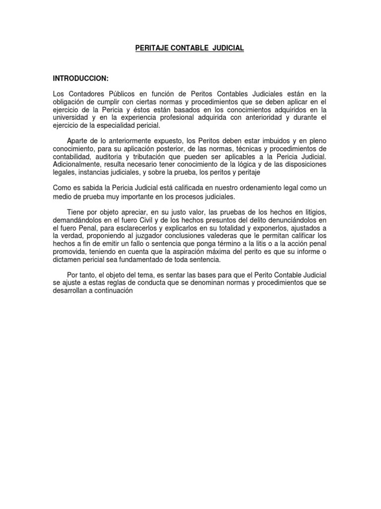 INTRODUCCION: Los Contadores Pblicos en funcin de Peritos Contables Judiciales estn en obligacin de cumplir con ciertas normas y procedimientos que se deben aplicar en ejercicio de la Pericia y stos estn basados en los conocimientos adquiridos en universidad y en la experiencia profesional adquirida con anterioridad y durante ejercicio de la especialidad pericial. la el la el
