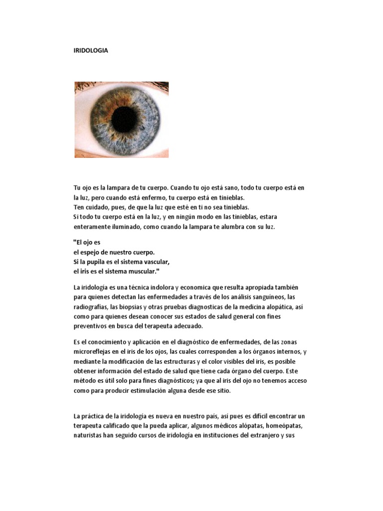 Tu ojo es la lampara de tu cuerpo. Cuando tu ojo est sano, todo tu cuerpo est en la luz, pero cuando est enfermo, tu cuerpo est en tinieblas. Ten cuidado, pues, de que la luz que est en ti no sea tinieblas. Si todo tu cuerpo est en la luz, y en ningn modo en las tinieblas, estara enteramente iluminado, como cuando la lampara te alumbra con su luz. "El ojo es el espejo de nuestro cuerpo. Si la pupila es el sistema vascular, el iris es el sistema muscular." La iridologa es una tcnica indolora y economica que resulta apropiada tambin para quienes detectan las enfermedades a travs de los anlisis sanguneos, las radiografas, las biopsias y otras pruebas diagnosticas de la medicina aloptica, as como para quienes desean conocer sus estados de salud general con fines preventivos en busca del terapeuta adecuado. Es el conocimiento y aplicacin en el diagnstico de enfermedades, de las zonas microreflejas en el iris de los ojos, las cuales corresponden a los rganos internos, y mediante la modificacin de las estructuras y el color visibles del iris, es posible obtener informacin del estado de salud que tiene cada rgano del cuerpo. Este mtodo es til solo para fines diagnsticos; ya que al iris del ojo no tenemos acceso como para producir estimulacin alguna desde ese sitio.