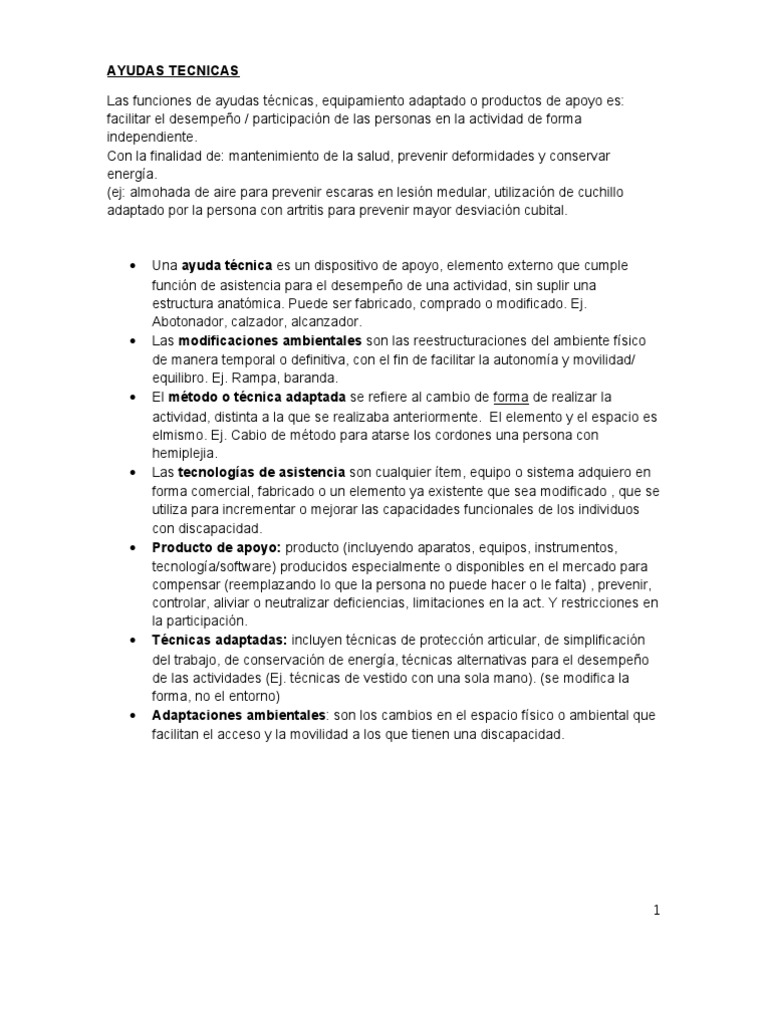 Una ayuda tcnica es un dispositivo de apoyo, elemento externo que cumple funcin de asistencia para el desempeo de una actividad, sin suplir una estructura anatmica. Puede ser fabricado, comprado o modificado. Ej. Abotonador, calzador, alcanzador. Las modificaciones ambientales son las reestructuraciones del ambiente fsico de manera temporal o definitiva, con el fin de facilitar la autonoma y movilidad/ equilibro. Ej. Rampa, baranda. El mtodo o tcnica adaptada se refiere al cambio de forma de realizar la actividad, distinta a la que se realizaba anteriormente. El elemento y el espacio es elmismo. Ej. Cabio de mtodo para atarse los cordones una persona con hemiplejia. Las tecnologas de asistencia son cualquier tem, equipo o sistema adquiero en forma comercial, fabricado o un elemento ya existente que sea modificado , que se utiliza para incrementar o mejorar las capacidades funcionales de los individuos con discapacidad. Producto de apoyo: producto (incluyendo aparatos, equipos, instrumentos, tecnologa/software) producidos especialmente o disponibles en el mercado para compensar (reemplazando lo que la persona no puede hacer o le falta) , prevenir, controlar, aliviar o neutralizar deficiencias, limitaciones en la act. Y restricciones en la participacin. Tcnicas adaptadas: incluyen tcnicas de proteccin articular, de simplificacin del trabajo, de conservacin de energa, tcnicas alternativas para el desempeo de las actividades (Ej. tcnicas de vestido con una sola mano). (se modifica la forma, no el entorno) Adaptaciones ambientales: son los cambios en el espacio fsico o ambiental que facilitan el acceso y la movilidad a los que tienen una discapacidad.