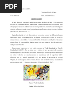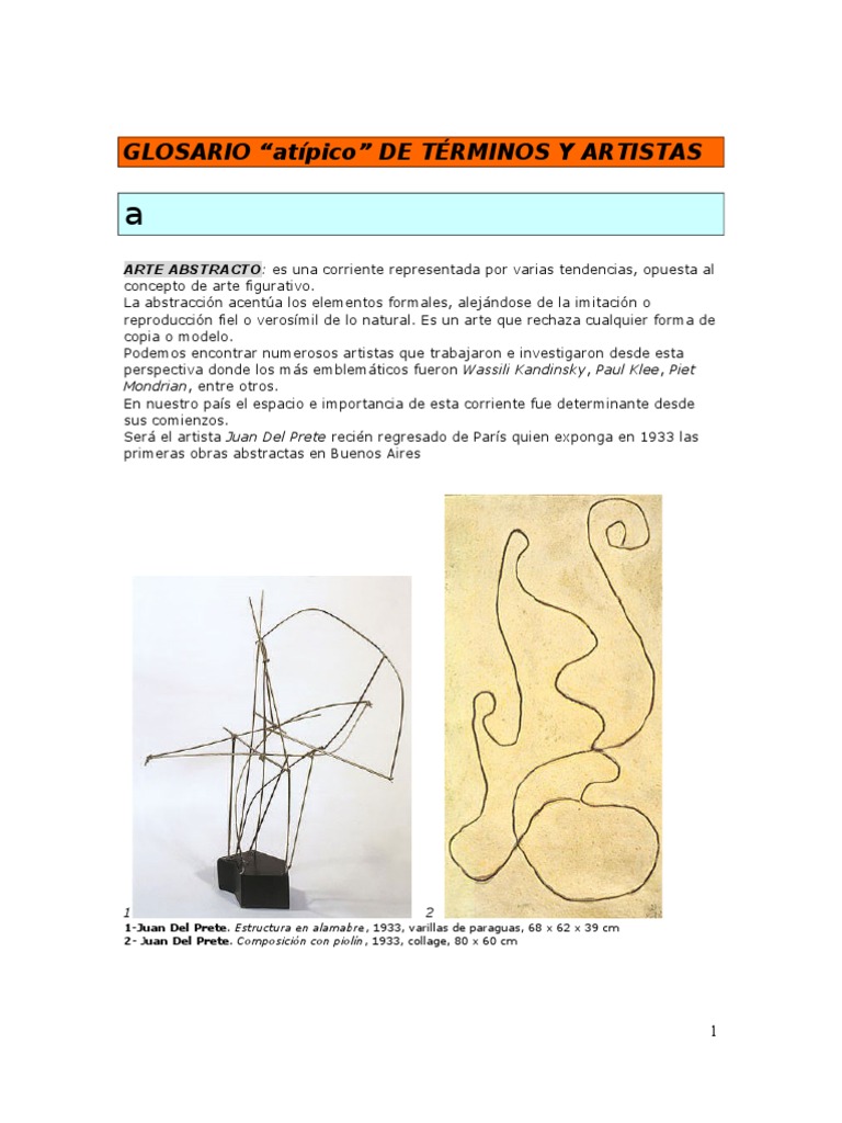 ARTE ABSTRACTO: es una corriente representada por varias tendencias, opuesta al concepto de arte figurativo. La abstraccin acenta los elementos formales, alejndose de la imitacin o reproduccin fiel o verosmil de lo natural. Es un arte que rechaza cualquier forma de copia o modelo. Podemos encontrar numerosos artistas que trabajaron e investigaron desde esta perspectiva donde los ms emblemticos fueron Wassili Kandinsky, Paul Klee, Piet Mondrian, entre otros. En nuestro pas el espacio e importancia de esta corriente fue determinante desde sus comienzos. Ser el artista Juan Del Prete recin regresado de Pars quien exponga en 1933 las primeras obras abstractas en Buenos Aires