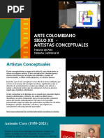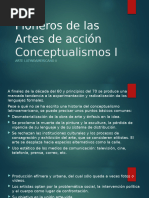 ARTE CONCEPTUAL: movimiento que investiga la esencia del hecho esttico ms que su realizacin material. La obra de arte puede ser vista esencialmente como el plano de un proceso de pensamiento, donde lo que prevalece es la idea. Algunos autores lo han definido como un arte que centra su atencin en la teora y una suerte de desentendimiento de la obra como objeto fsico. Revisten ms importancia los procesos que la obra terminada. Este giro hacia la idea trae como consecuencia un nuevo tipo de espectador que desplegar un nuevo modo de atencin y de participacin mental. Ese movimiento represent las propuestas introducidas por el artista Marcel Duchamp, quien estaba ms interesado por las ideas que por el producto final. A partir de ese momento, el arte no volvi a ser el mismo, ya que poda existir fuera de los medios convencionales como la pintura y la escultura- sobre todo, por encima de las consideraciones del buen gusto. El Arte Conceptual fue, en esencia, un arte de estructura intelectual, segn la forma que eligiera el artista.