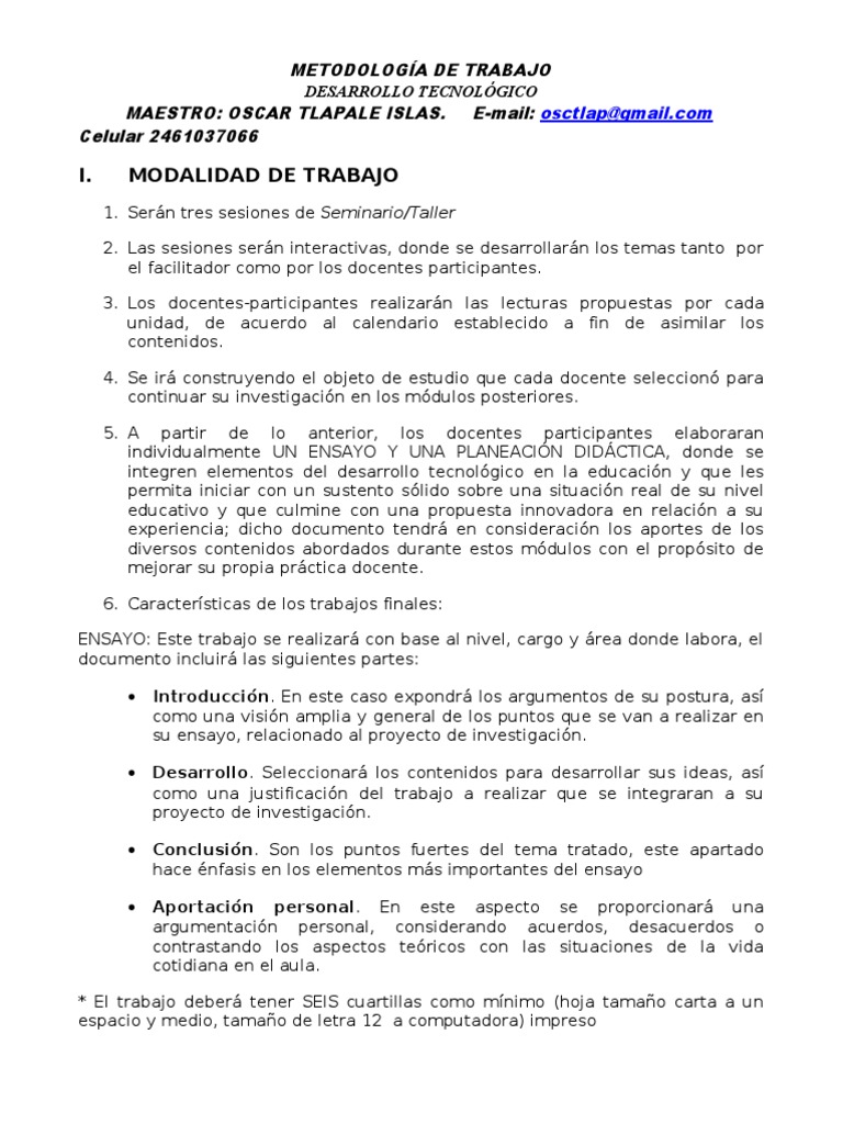 1. Sern tres sesiones de Seminario/Taller 2. Las sesiones sern interactivas, donde se desarrollarn los temas tanto por el facilitador como por los docentes participantes. 3. Los docentes-participantes realizarn las lecturas propuestas por cada unidad, de acuerdo al calendario establecido a fin de asimilar los contenidos. 4. Se ir construyendo el objeto de estudio que cada docente seleccion para continuar su investigacin en los mdulos posteriores. 5. A partir de lo anterior, los docentes participantes elaboraran individualmente UN ENSAYO Y UNA PLANEACIN DIDCTICA, donde se integren elementos del desarrollo tecnolgico en la educacin y que les permita iniciar con un sustento slido sobre una situacin real de su nivel educativo y que culmine con una propuesta innovadora en relacin a su experiencia; dicho documento tendr en consideracin los aportes de los diversos contenidos abordados durante estos mdulos con el propsito de mejorar su propia prctica docente. 6. Caractersticas de los trabajos finales: