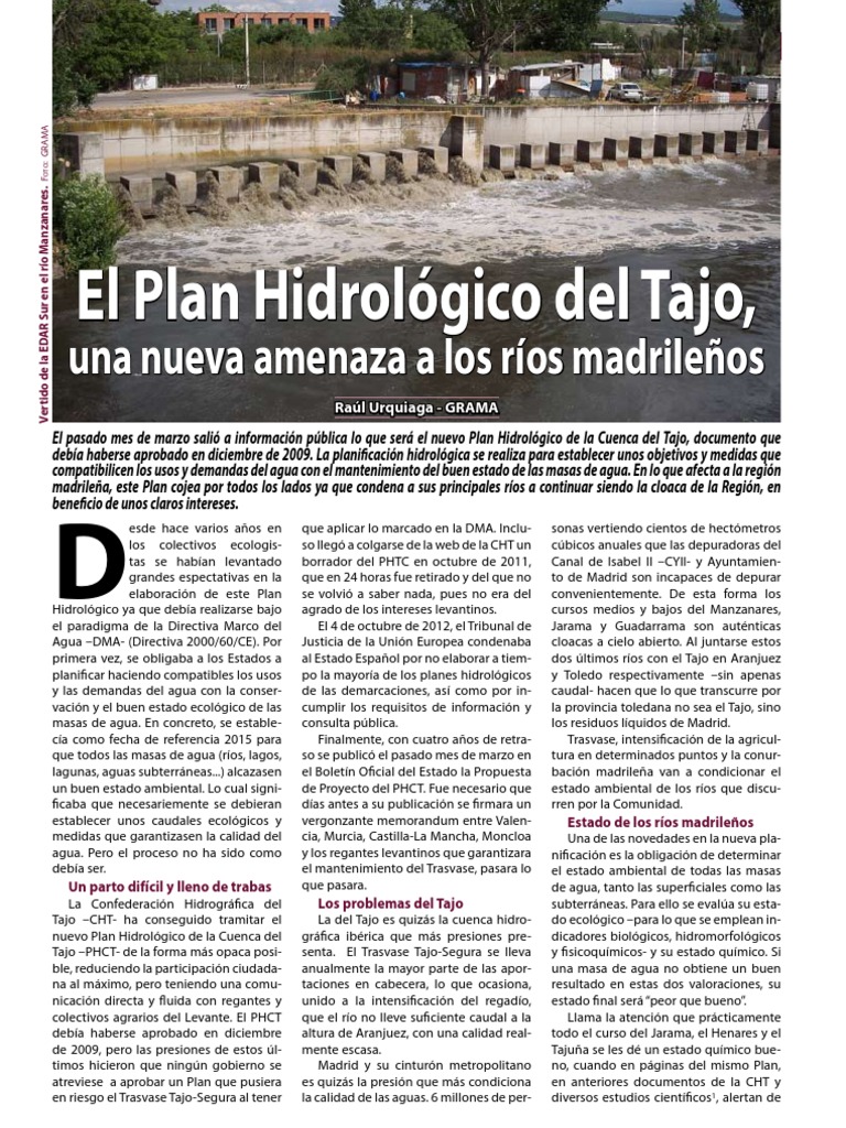 El pasado mes de marzo sali a informacin pblica lo que ser el nuevo Plan Hidrolgico de la Cuenca del Tajo, documento que deba haberse aprobado en diciembre de 2009. La planificacin hidrolgica se realiza para establecer unos objetivos y medidas que compatibilicen los usos y demandas del agua con el mantenimiento del buen estado de las masas de agua. En lo que afecta a la regin madrilea, este Plan cojea por todos los lados ya que condena a sus principales ros a continuar siendo la cloaca de la Regin, en beneficio de unos claros intereses.