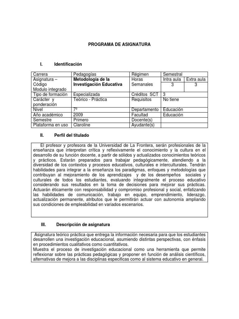 Identificacin Pedagogas Metodologa de la Investigacin Educativa Especializada Terico - Prctica 7 2009 Primero Claroline Rgimen Horas Semanales Crditos SCT Requisitos Departamento Facultad Docente(s) Ayudante(s) Semestral Intra aula Extra aula 3 3 3 No tiene Educacin Educacin