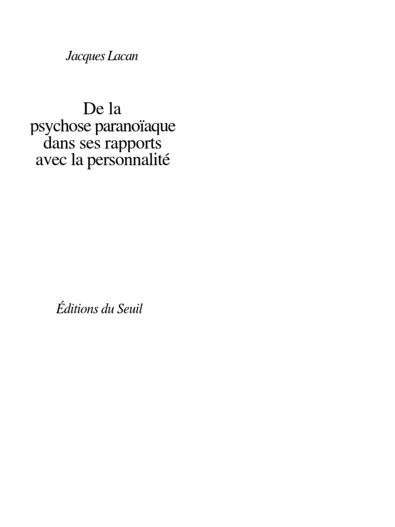 * CET OUVRAGE, QUI CONSTITUAIT LA THÈSE DE DOCTORAT EN MÉDECINE DE JACQUES LACAN, A PARU INITIALEMENT CHEZ LE FRANÇOIS A PARIS, EN 1932.