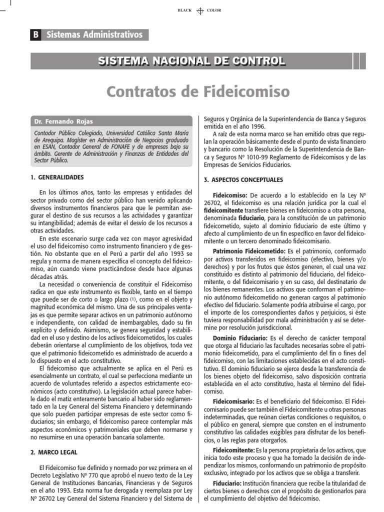 1. Generalidades En los ltimos aos, tanto las empresas y entidades del sector privado como del sector pblico han venido aplicando diversos instrumentos financieros para que le permitan asegurar el destino de sus recursos a las actividades y garantizar su intangibilidad; adems de evitar el desvo de los recursos a otras actividades. En este escenario surge cada vez con mayor agresividad el uso del fideicomiso como instrumento financiero y de gestin. No obstante que en el Per a partir del ao 1993 se regula y norma de manera especfica el concepto del fideicomiso, an cuando viene practicndose desde hace algunas dcadas atrs. La necesidad o conveniencia de constituir el Fideicomiso radica en que este instrumento es flexible, tanto en el tiempo que puede ser de corto o largo plazo (1), como en el objeto y magnitud econmica del mismo. Una de sus principales ventajas es que permite separar activos en un patrimonio autnomo e independiente, con calidad de inembargables, dado su fin explcito y definido. Asimismo, se genera seguridad y estabilidad en el uso y destino de los activos fideicometidos, los cuales debern orientarse al cumplimiento de los objetivos, toda vez que el patrimonio fideicometido es administrado de acuerdo a lo dispuesto en el acto constitutivo. El fideicomiso que actualmente se aplica en el Per es esencialmente un contrato, el cual se perfecciona mediante un acuerdo de voluntades referido a aspectos estrictamente econmicos (acto constitutivo). La legislacin actual parece haberle dado el matiz enteramente bancario al haber sido reglamentado en la Ley General del Sistema Financiero y determinando que solo pueden participar empresas de este sector como fiduciarios; sin embargo, el fideicomiso parece contemplar ms aspectos econmicos y patrimoniales que deben normarse y no resumirse en una operacin bancaria solamente. 2. Marco legal El Fideicomiso fue definido y normado por vez primera en el Decreto Legislativo N 770 que aprob el nuevo texto de la Ley General de Instituciones Bancarias, Financieras y de Seguros en el ao 1993. Esta norma fue derogada y reemplaza por Ley N 26702 Ley General del Sistema Financiero y del Sistema de