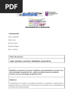 Objetivo Procedimiento Ejercitarse en realizar deducciones y comprender el concepto de deduccin. Se piden dos voluntarios a quienes se les hace salir del saln donde estn reunidos. El resto de participantes escoge dos nombres de compaeros conocidos para que los que han salido averigen quienes son. Se le pide a uno que pase y se le dice que el que est afuera va a representar a Anabel. Otros compaeros le dicen al que se qued afuera que el que est adentro va a representar a Freddy. Los voluntarios deben descubrir a quin estn representando guindose por las preguntas que el otro le hace (ya que cada uno conoce a quin representa el otro compaero). Las preguntas no deben ser demasiado reveladoras, pero deben ser sobre algo propio de esa persona a quien el otro representa (trabajo, familia, caractersticas, etc.) se le da un premio al que averigua primero a quien est l representando. Se hace una reflexin de cmo llegaron o no a descubrir su otra personalidad y sobre la importancia de ordenar datos parciales de manera correcta para llegar a una deduccin acertada. Enfatizar la importancia de la deduccin para tener un buen anlisis de las situaciones que nos ocurren en la vida diaria. Ver cmo se pasa de la descripcin de cosas o situaciones particulares a la interpretacin del conjunto, y la importancia de hacer este proceso seriamente cuando queremos entender lo que sucede en nuestro barrio, comunidad u organizacin. Disposicin Creatividad Es variable