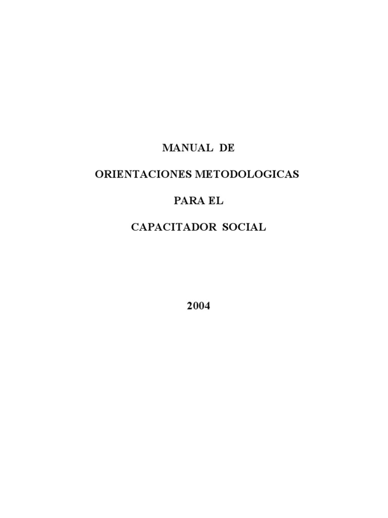 Este manual es una herramienta para el Capacitador Social y est elaborado de manera tal que le permita al capacitador social desarrollar el proceso de capacitacin, aplicando las estrategias metodolgicas apropiadas y gestionando de manera adecuada el tiempo a fin de optimizar el aprendizaje de la poblacin adulta de las comunidades rurales. Contiene conceptos bsicos para ampliar los conocimientos sobre cmo aprenden las personas adultas cul es el estilo de aprendizaje que predomina en un determinado grupo de personasde las comunidades rurales y cules son las estrategias que apoyan su proceso de aprendizaje y ayudan a fortalecer sus capacidades. Propone algunas estrategias metodolgicas participativas y activas que pueden ser usadas para el fortalecimiento de las capacidades comunales y de gestin comunal, con un enfoque andraggico o de educacin de adultos. Estas estrategias contribuyen a que los participantes no slo asimilen conocimientos, sino bsicamente a que generen nuevas habilidades y actitudes orientadas al desarrollo sostenible de la comunidad, que son la mejor garanta de sostenibilidad de los proyectos de inversin social que atiende FONCODES. Finalmente, se propone algunas sugerencias metodolgicas sobre cmo desarrollar una sesin o taller de capacitacin, las que deben ser adaptadas a las caractersticas de cada tema y a los requerimientos de cada grupo humano. Se proponen algunos ejemplos de metodologas y tcnicas que pueden ser aplicadas en las capacitaciones a la comunidad.
